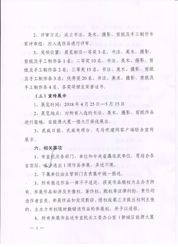 現(xiàn)將中共武威市委宣傳部、中共武威市直屬機關(guān)工作委員會《關(guān)于舉辦市直機關(guān)“不忘初心? 牢記使命”藝術(shù)作品展的通知》(武市直發(fā)〔2018〕9號)轉(zhuǎn)發(fā)你們,請各部門、單位根據(jù)要求認真組織,積極參與。將參賽作品于4月2日前報宣傳統(tǒng)戰(zhàn)部辦公室,宣傳統(tǒng)戰(zhàn)部對報送作品匯總后統(tǒng)一報送市直屬機關(guān)工委。