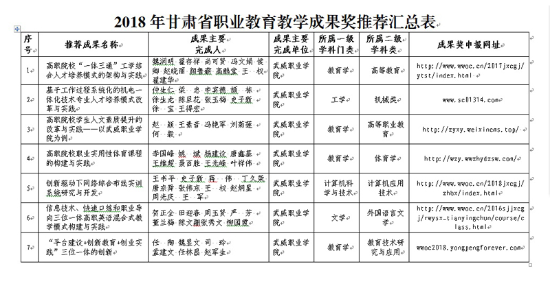 關(guān)于學(xué)院擬推薦2018年甘肅省職業(yè)教育教學(xué)成果獎評選的公示