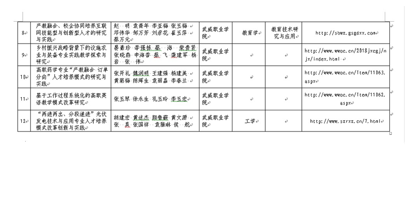 根據(jù)甘肅省人力資源和社會保障廳、甘肅省教育廳《關(guān)于開展2018年甘肅省職業(yè)教育教學(xué)成果獎評選表彰工作的通知》精神,經(jīng)個人申報,學(xué)院審核,決定擬推薦以下所提交紙質(zhì)材料、電子材料、申報網(wǎng)站等符合申報要求的12項(xiàng)教學(xué)成果參評2018年甘肅省職業(yè)教育教學(xué)成果獎,現(xiàn)予以公示。