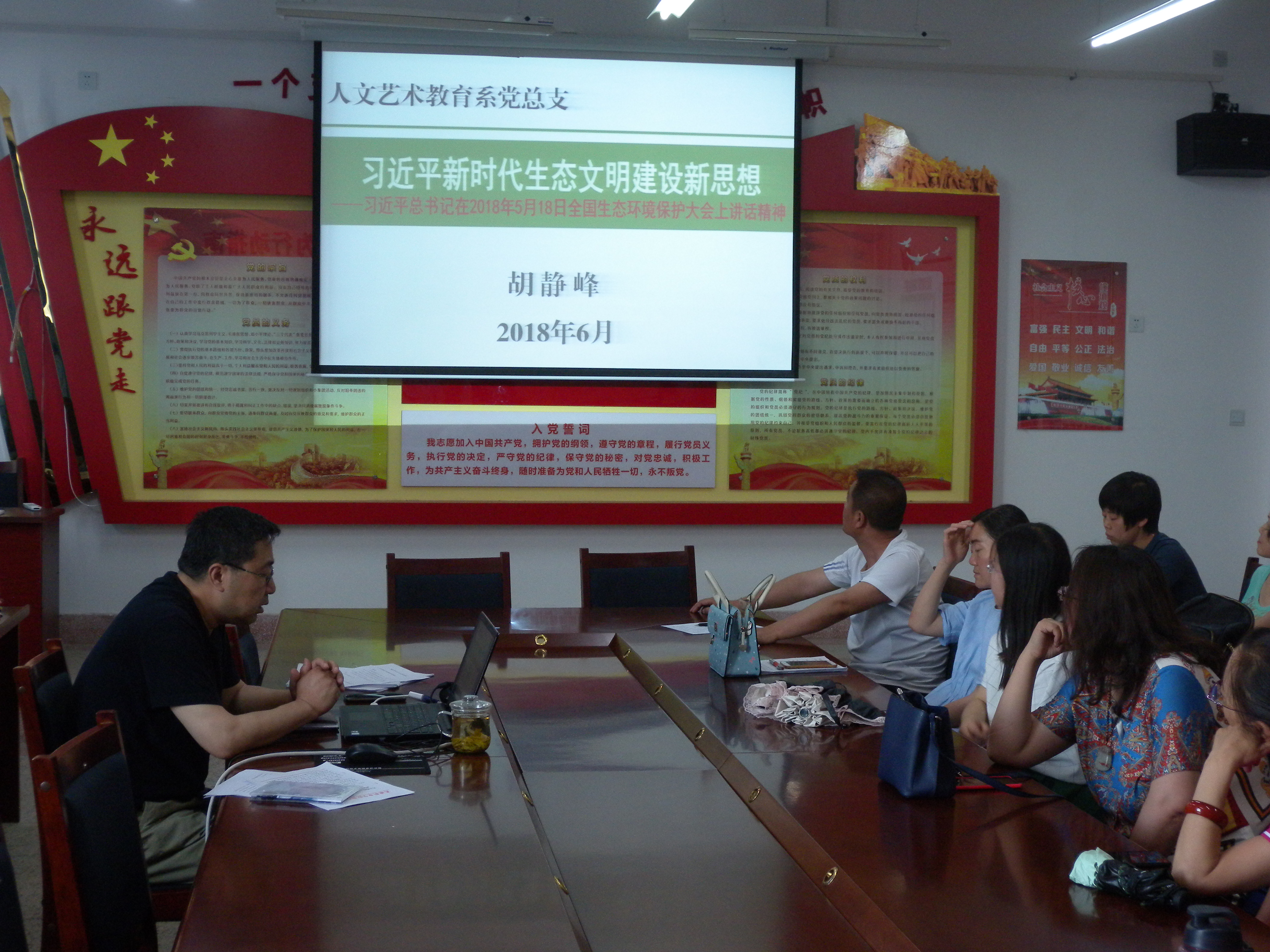 為深入學(xué)習(xí)習(xí)近平新時代中國特色社會主義思想,人文藝術(shù)教育系黨總支于6月13日下午在勵勤樓209黨員活動室開展書記講黨課活動。黨課由系黨總支書記胡靜峰主講,題目為《習(xí)近平新時代生態(tài)文明建設(shè)新思想》,系全體黨員參加了此次活動。