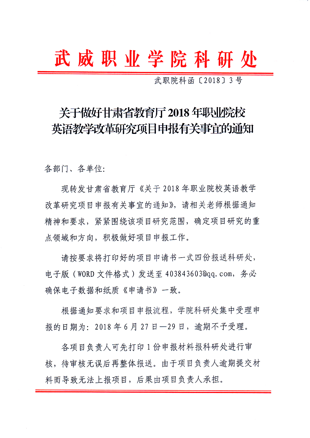 武職院科函〔2018〕3號——關(guān)于做好甘肅省教育廳2018年職業(yè)院校英語教學(xué)改革研究項目申報有關(guān)事宜的通知