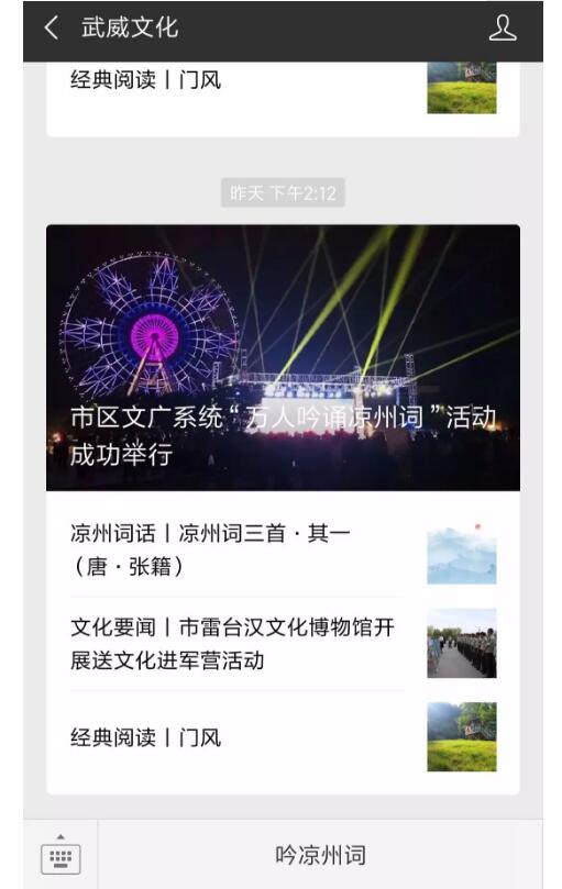 1.打開“武威文化”公眾號,點擊最下方“吟涼州詞”進(jìn)入活動“萬人吟誦涼州詞”活動頁面。