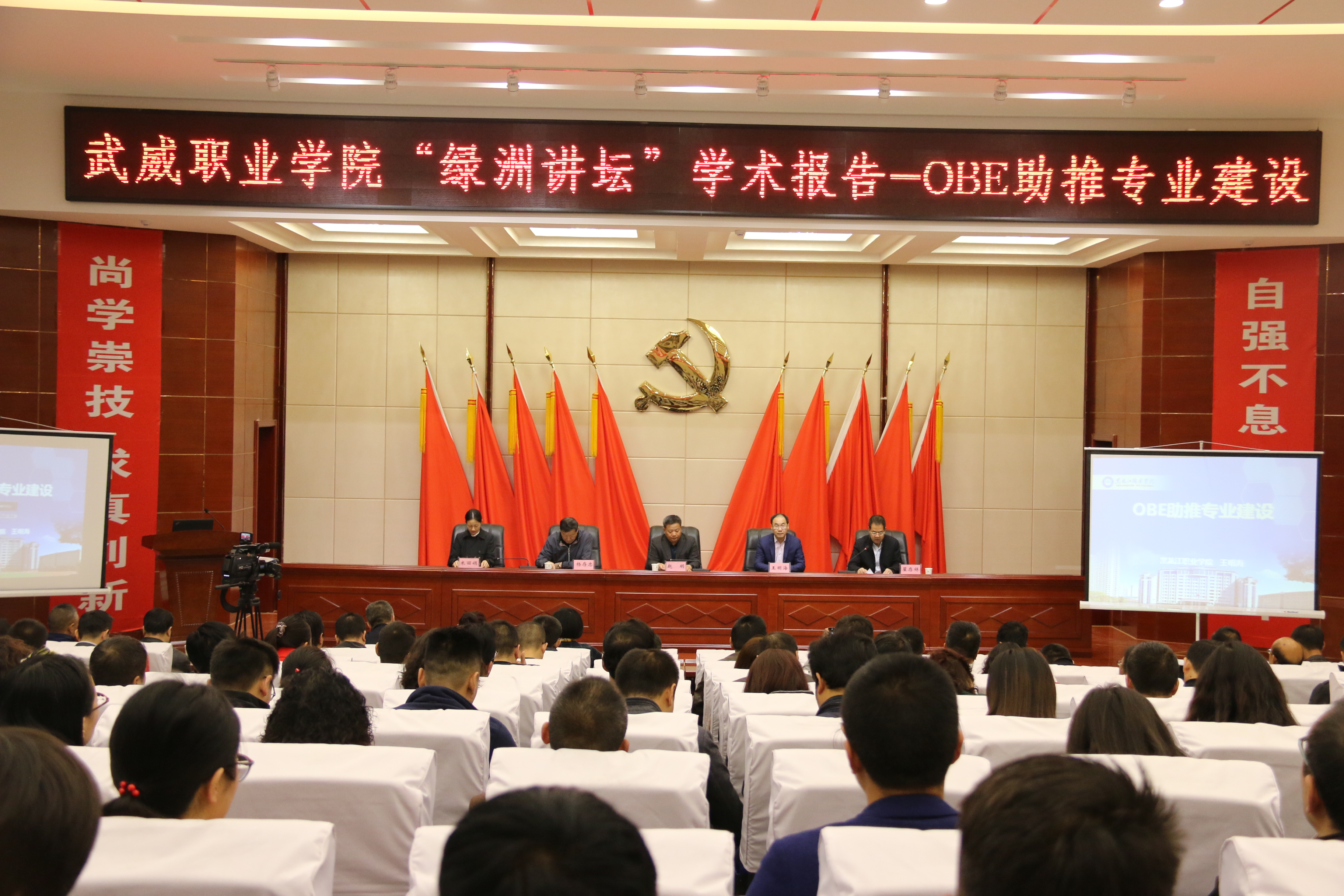 10月29日上午,“綠洲講壇”系列學(xué)術(shù)報告第二講在武威職業(yè)學(xué)院菁英廳舉行,報告會由中科低碳新能源技術(shù)學(xué)院承辦,黑龍江職業(yè)學(xué)院、黑龍江省經(jīng)濟(jì)管理干部學(xué)院副院長王明海教授主講,學(xué)院黨委委員、副院長翟存祥主持,中科低碳新能源技術(shù)學(xué)院院長楊存忠教授,中科低碳新能源技術(shù)學(xué)院院長助理米麗娟博士,武威職業(yè)學(xué)院黨委書記、院長趙明教授和學(xué)院中層干部教研室主任、骨干教師代表以及甘肅畜牧工程職業(yè)技術(shù)學(xué)院領(lǐng)導(dǎo)和教學(xué)系主任應(yīng)邀參加了本次活動。
