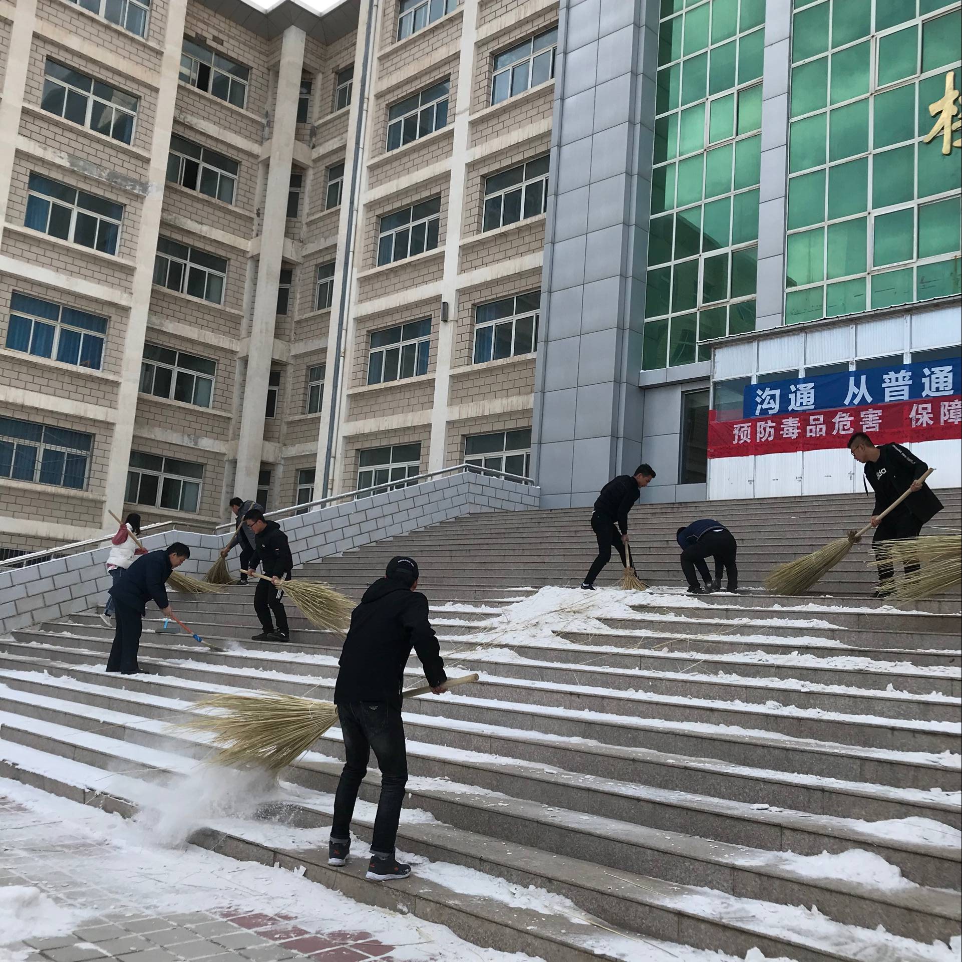 此次活動(dòng)在博學(xué)樓前開展,10多名黨員及入黨積極分子參加此次活動(dòng)。大家?guī)е鴴咧?、簸箕等清掃工具,在利用課間操的時(shí)間將行人走道及樓梯的落雪全部清掃干凈,為校園師生提供了良好的行走安全、衛(wèi)生環(huán)境。