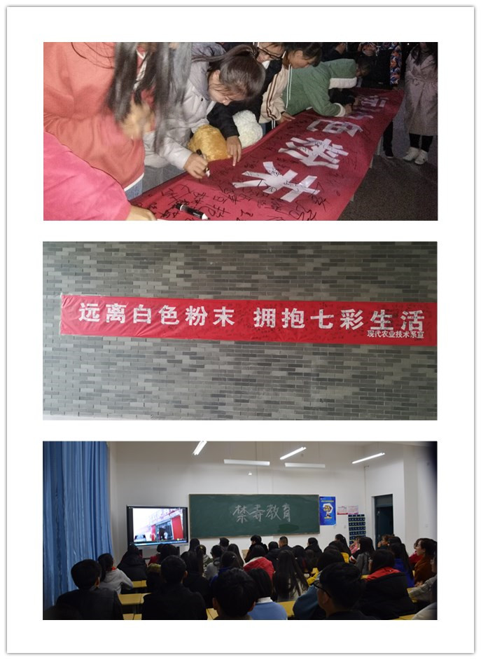 現(xiàn)代農(nóng)業(yè)技術(shù)系結(jié)合自身實際和條件,重點開展了以下活動。一是通過在行樹樓張貼“遠(yuǎn)離白色粉末擁抱七彩生活”禁毒橫幅,號召全系師生創(chuàng)建和諧、文明、無毒的校園環(huán)境;二是各班開展了禁毒宣傳主題班會,宣傳毒品危害,普及防毒知識,警示大家珍愛生命,遠(yuǎn)離毒品;三是組織學(xué)生參加學(xué)院禁毒征文大賽,用語言表達(dá)禁毒的決心;四是團學(xué)會組織各班同學(xué)網(wǎng)上參觀“中國禁毒數(shù)字展覽館”,觀看禁毒題材的優(yōu)秀微電影《一路有你》、《少年的秘密》、《蛻變》、《愛心帶你回家》,讓在場同學(xué)深刻感受到毒品的危害,堅定了同學(xué)們禁毒防毒的信心。
