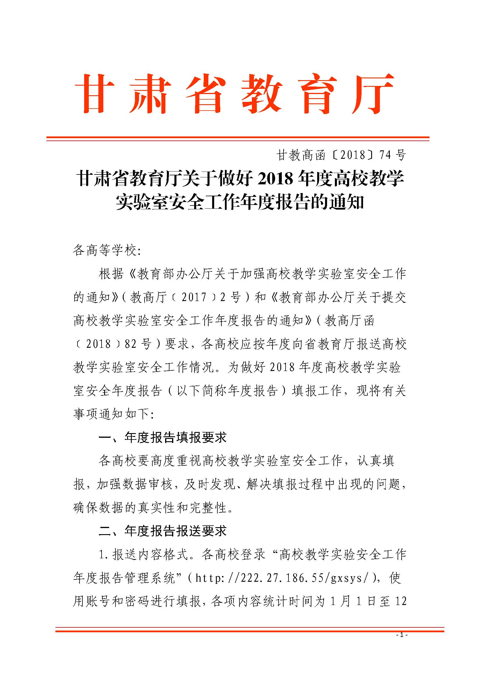 甘肅省教育廳關(guān)于做好2018年度高校教學實驗室安全工作年度報告的通知