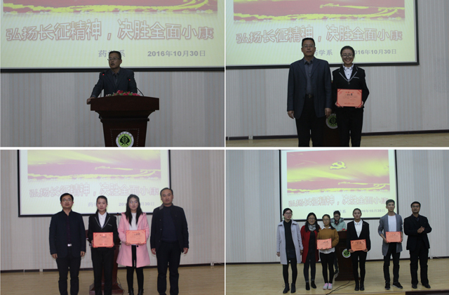 為紀(jì)念紅軍長(zhǎng)征勝利80周年,激發(fā)師生弘揚(yáng)偉大的長(zhǎng)征精神,同時(shí)為豐富校園文化生活,展示青春正能量,藥學(xué)系團(tuán)總支依據(jù)院團(tuán)委的通知精神和系團(tuán)學(xué)工作委員會(huì)關(guān)于增加學(xué)生課余活動(dòng)的會(huì)議要求,于10月30日在正德廳組織開展了“傳承長(zhǎng)征精神,筑我青春夢(mèng)想”主題演講比賽。藥學(xué)系主任魏潤(rùn)明出席了本次活動(dòng),各班班主任擔(dān)任本次比賽評(píng)委,2016級(jí)全體學(xué)生和2015級(jí)各班學(xué)生代表觀看了比賽。