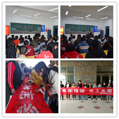 首先蔡海老師向同學(xué)們細(xì)致地講解了今年的征兵條件、報(bào)名方法及相關(guān)優(yōu)待政策,深入宣傳依法服兵役的積極意義,鼓勵(lì)適齡青年積極報(bào)名應(yīng)征,報(bào)效祖國。同時(shí)邀請2017級設(shè)施農(nóng)業(yè)與裝備大專班趙文文同學(xué)做了個(gè)人事跡匯報(bào)。該生曾在陸軍某部服役,現(xiàn)光榮退伍,回校就讀。交流中,他鼓勵(lì)同學(xué)們要敢于有夢、敢于追夢、敢于圓夢,讓青春在軍營的歷練中、在為祖國的奉獻(xiàn)中閃光。他還生動(dòng)的講述了部隊(duì)的生活和訓(xùn)練情況,這段經(jīng)歷使他收獲了遠(yuǎn)大的理想信念,培養(yǎng)了良好的行為習(xí)慣,練就了強(qiáng)健的身體,這些將會讓他終身受益?;顒?dòng)最后進(jìn)行了“參軍報(bào)國,無上光榮”主題簽名儀式。