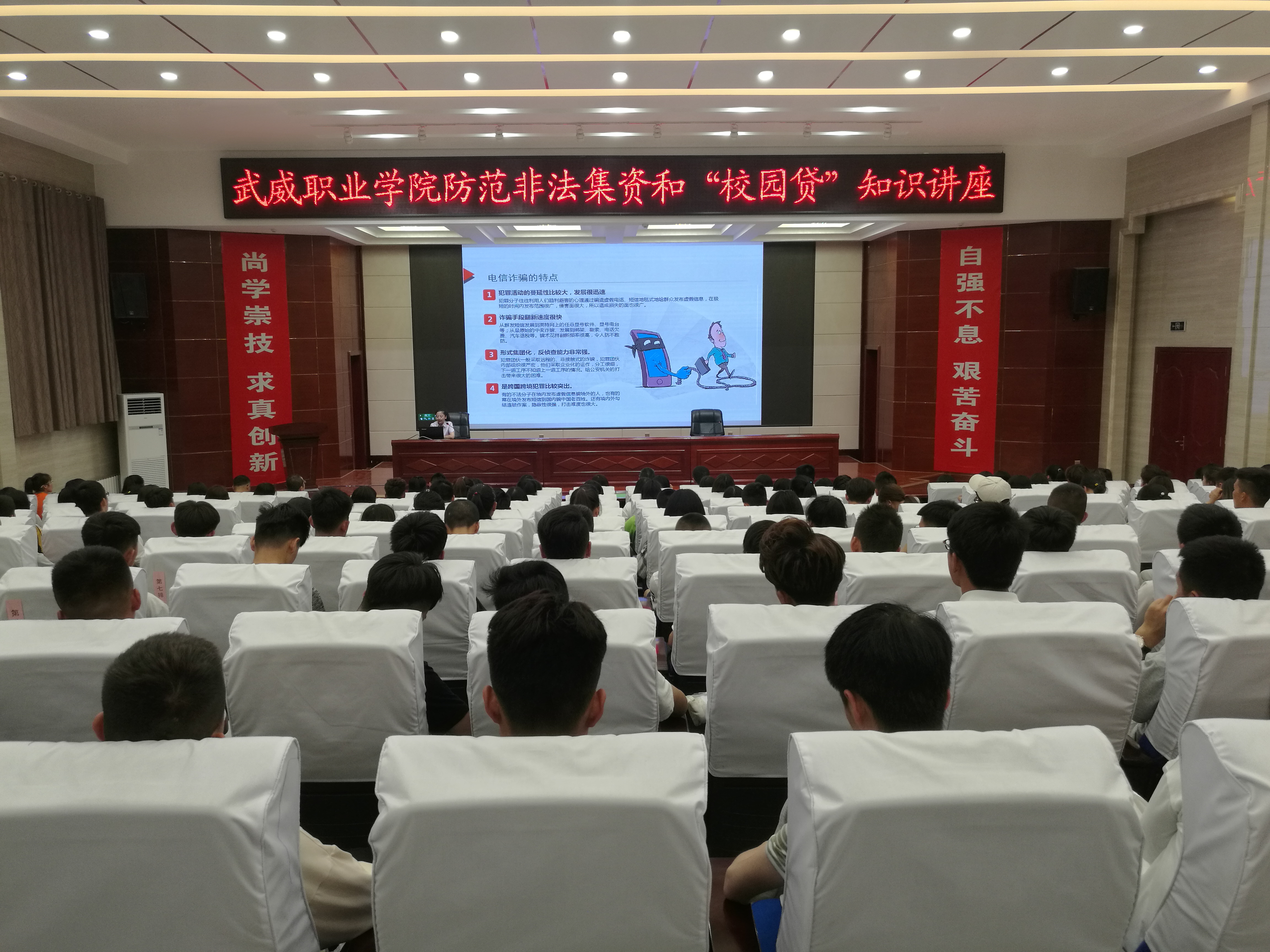 為深入貫徹落實甘肅省2019年防范非法集資和金融領域掃黑除惡宣傳月活動的有關精神,保護廣大師生的合法權益。6月9日晚,學院邀請中國農業(yè)銀行武威支行風險管理部工作人員朱琳在學院菁英廳作了關于防范非法集資和校園貸知識講座,學院副院長王永緒出席活動,保衛(wèi)處、計劃財務處負責同志及各系師生代表200余人聆聽了講座。