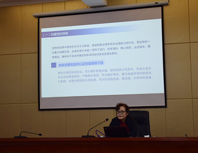 晏素珍以《中共中央關(guān)于堅(jiān)持和完善中國特色社會主義制度推進(jìn)國家治理體系和治理能力現(xiàn)代化若干重大問題的決定》的學(xué)習(xí)與解讀為題,重點(diǎn)就全會召開的背景、意義和看點(diǎn);《決定》的基本框架和主要內(nèi)容以及抓好全會的學(xué)習(xí)貫徹的具體要求進(jìn)行了宣講。要求廣大師生提高政治站位,樹牢“四個(gè)意識”,堅(jiān)定“四個(gè)自信”,做到“兩個(gè)維護(hù)”,推動全會精神在全系落地生根、取得扎實(shí)成效。為實(shí)現(xiàn)“兩個(gè)一百年”奮斗目標(biāo),實(shí)現(xiàn)中華民族偉大復(fù)興的中國夢而努力奮斗。