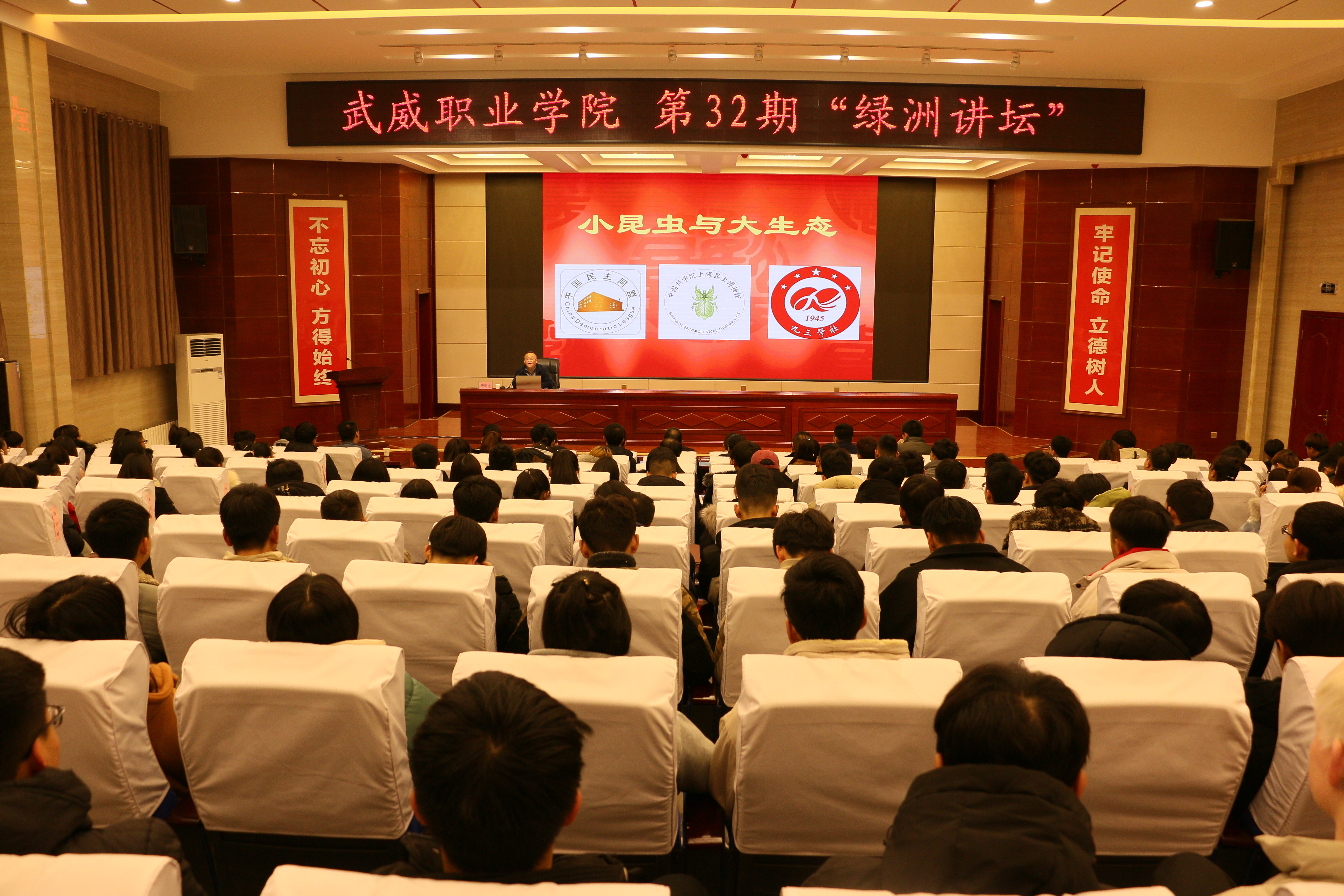 12月18日,武威職業(yè)學(xué)院“綠洲講壇”第32期在學(xué)院菁英廳舉行,本期活動(dòng)邀請到中國科學(xué)院上海昆蟲博物館館長殷海生教授作主題為“小昆蟲與大生態(tài)”的報(bào)告。學(xué)院現(xiàn)代農(nóng)業(yè)技術(shù)系相關(guān)專業(yè)學(xué)生、中科低碳新能源技術(shù)學(xué)院師生代表共220人聆聽了報(bào)告。本期講壇由能源工程系黨總支書記胡建宏主持。