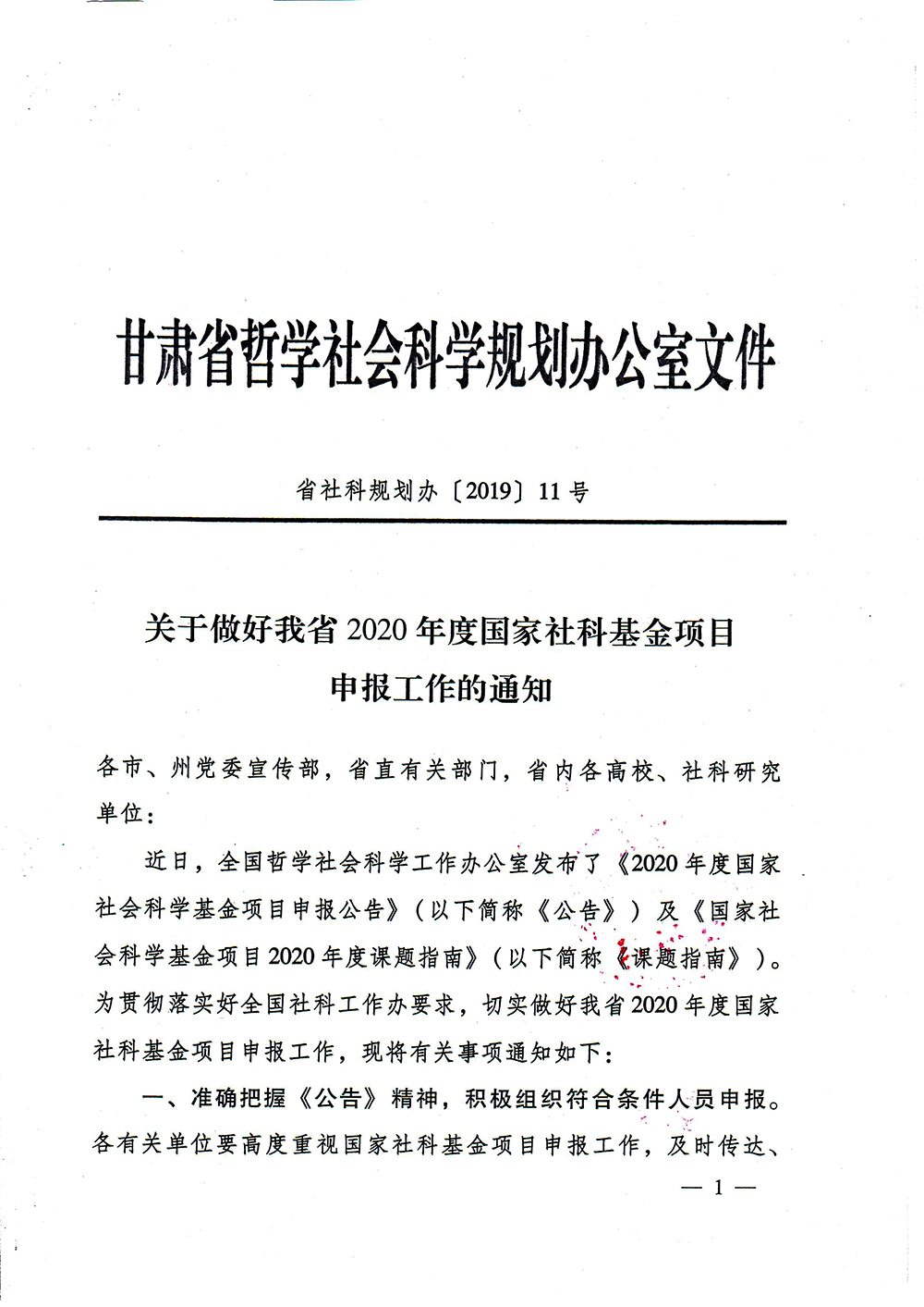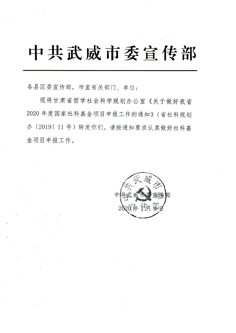 轉(zhuǎn)發(fā)中共武威市委宣傳部《關(guān)于做好甘肅省2020年度國家社科基金項目申報工作的通知》