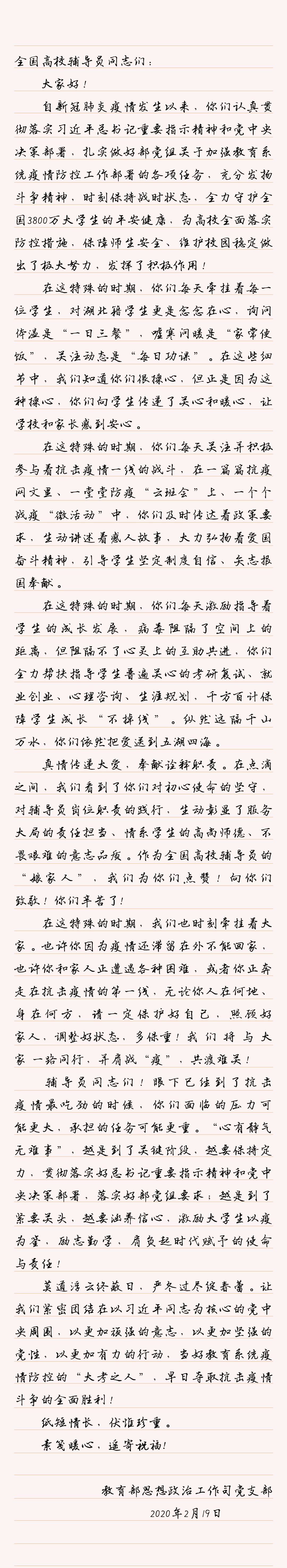 共克時(shí)艱 勠力同行 | 教育部思政司黨支部致全國(guó)高校輔導(dǎo)員的一封信