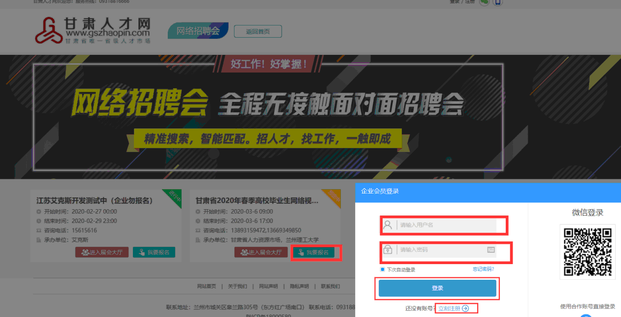 1.登錄甘肅人才網(wǎng)(www.gszhaopin.com),點(diǎn)擊菜單欄“招聘會(huì)”—“網(wǎng)絡(luò)招聘會(huì)”進(jìn)入二級(jí)頁(yè)面菜單,進(jìn)入網(wǎng)絡(luò)招聘會(huì)列表—選擇“武威職業(yè)學(xué)院2020屆醫(yī)藥衛(wèi)生類畢業(yè)生網(wǎng)絡(luò)視頻雙選會(huì)”點(diǎn)擊“我要報(bào)名”按鈕,登錄企業(yè)后臺(tái)(無(wú)賬號(hào)點(diǎn)擊“立即注冊(cè)”,資質(zhì)通過(guò)審核后再報(bào)名),待定審核。