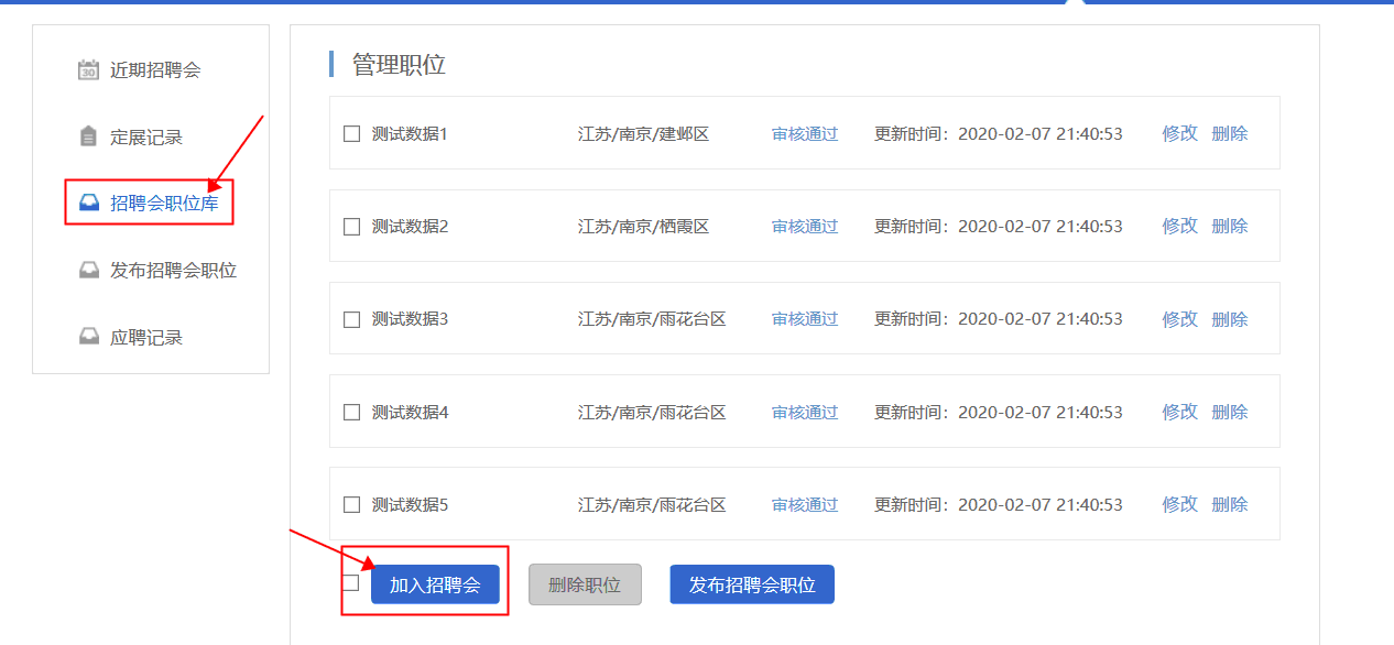 2.企業(yè)通過(guò)后臺(tái)中心“網(wǎng)絡(luò)招聘會(huì)”欄目——點(diǎn)擊發(fā)布招聘會(huì)職位(等待審核)——審核通過(guò)后,將“招聘會(huì)職位庫(kù)”中的職位加入到“武威職業(yè)學(xué)院2020屆醫(yī)藥衛(wèi)生類畢業(yè)生網(wǎng)絡(luò)視頻雙選會(huì)”,職位將在網(wǎng)絡(luò)招聘大廳中進(jìn)行展示。