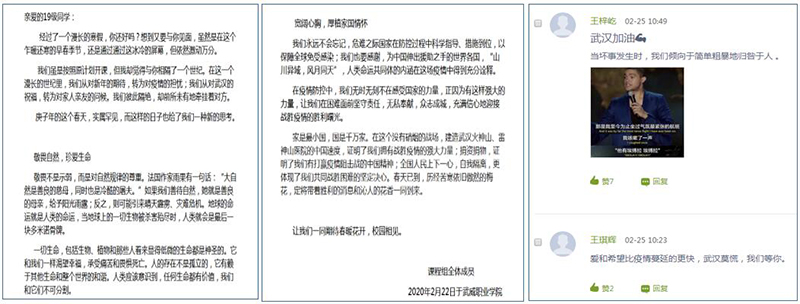 《中華優(yōu)秀傳統(tǒng)文化》課程團(tuán)隊(duì)的馮文娟老師在開學(xué)第一天借助在線教學(xué)平臺向?qū)W生推送了《致2019級學(xué)生的一封信》,激勵(lì)學(xué)生要敬畏自然、珍愛生命,致敬英雄、感恩榜樣,寬闊心胸、厚植家國情懷。信中這樣寫道:“在疫情防控中,我們無時(shí)無刻不在感受國家的力量,正因?yàn)橛羞@樣強(qiáng)大的力量,讓我們在困難面前堅(jiān)守責(zé)任,無私奉獻(xiàn),眾志成城,充滿信心地迎接戰(zhàn)勝疫情的勝利曙光?!薄?家是最小國,國是千萬家。在這個(gè)沒有硝煙的戰(zhàn)場,建造武漢火神山、雷神山醫(yī)院的中國速度,證明了我們擁有戰(zhàn)勝疫情的強(qiáng)大力量;捐資捐物,證明了我們有打贏疫情阻擊戰(zhàn)的中國精神;全國人民上下一心,自我隔離,更體現(xiàn)了我們共同戰(zhàn)勝困難的堅(jiān)定決心。春天已到,歷經(jīng)苦寒依舊傲然的梅花,定將帶著勝利的消息和沁人的花香一同到來?!蓖瑫r(shí),為學(xué)生推送由央視頻和有道精品課共同錄制的《面對疫情教你如何有效防范》疫情防控專題視頻,與學(xué)生一起為打贏新冠肺炎疫情防控阻擊戰(zhàn)貢獻(xiàn)力量。