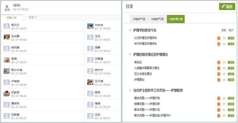 根據(jù)教學(xué)實(shí)際,護(hù)理制定了線上教學(xué)工作方案,對線上教學(xué)工作做出統(tǒng)一安排,強(qiáng)調(diào)了線上教學(xué)督導(dǎo)、任課教師和班主任的具體工作職責(zé)。2月24日,各項(xiàng)教學(xué)工作有序開展。共24名教師完成 11門課程的在線教學(xué)任務(wù),主要依托學(xué)院在線教學(xué)平臺、中國大學(xué)MOOC、人衛(wèi)慕課、智慧職教平臺上完成授課,上課學(xué)生1510人。通過多層次多方位的監(jiān)控?cái)?shù)據(jù)分析,全系在線教學(xué)整體運(yùn)行平穩(wěn)有序,管理人員組織管理到位,教師盡職盡責(zé),課堂授課方式靈活多樣,學(xué)生積極互動(dòng),在線教學(xué)課堂效果良好,達(dá)到預(yù)期。學(xué)生平均到課率達(dá)到99%以上,積極落實(shí)了在線教學(xué)對學(xué)生“全覆蓋”的要求。教師在教學(xué)平臺上完成視頻、電子教材、PPT等資源上傳,積極開展課前預(yù)習(xí)、主題討論、隨堂測驗(yàn)、作業(yè)布置等各類線上課堂教學(xué)活動(dòng),充分調(diào)動(dòng)學(xué)生的學(xué)習(xí)主動(dòng)性,學(xué)習(xí)效果良好。