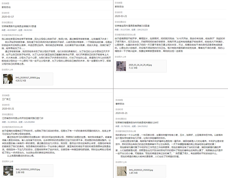 結(jié)合同學(xué)們生活和學(xué)習(xí)實(shí)際,學(xué)工處要求廣大同學(xué)積極參與志愿服務(wù)、春耕勞動(dòng)、工廠務(wù)工、家務(wù)勞動(dòng)等方面勞動(dòng)實(shí)踐,完成每周不少于2小時(shí)的實(shí)踐鍛煉,并通過信息化平臺(tái)上報(bào)活動(dòng)照片和勞動(dòng)心得。