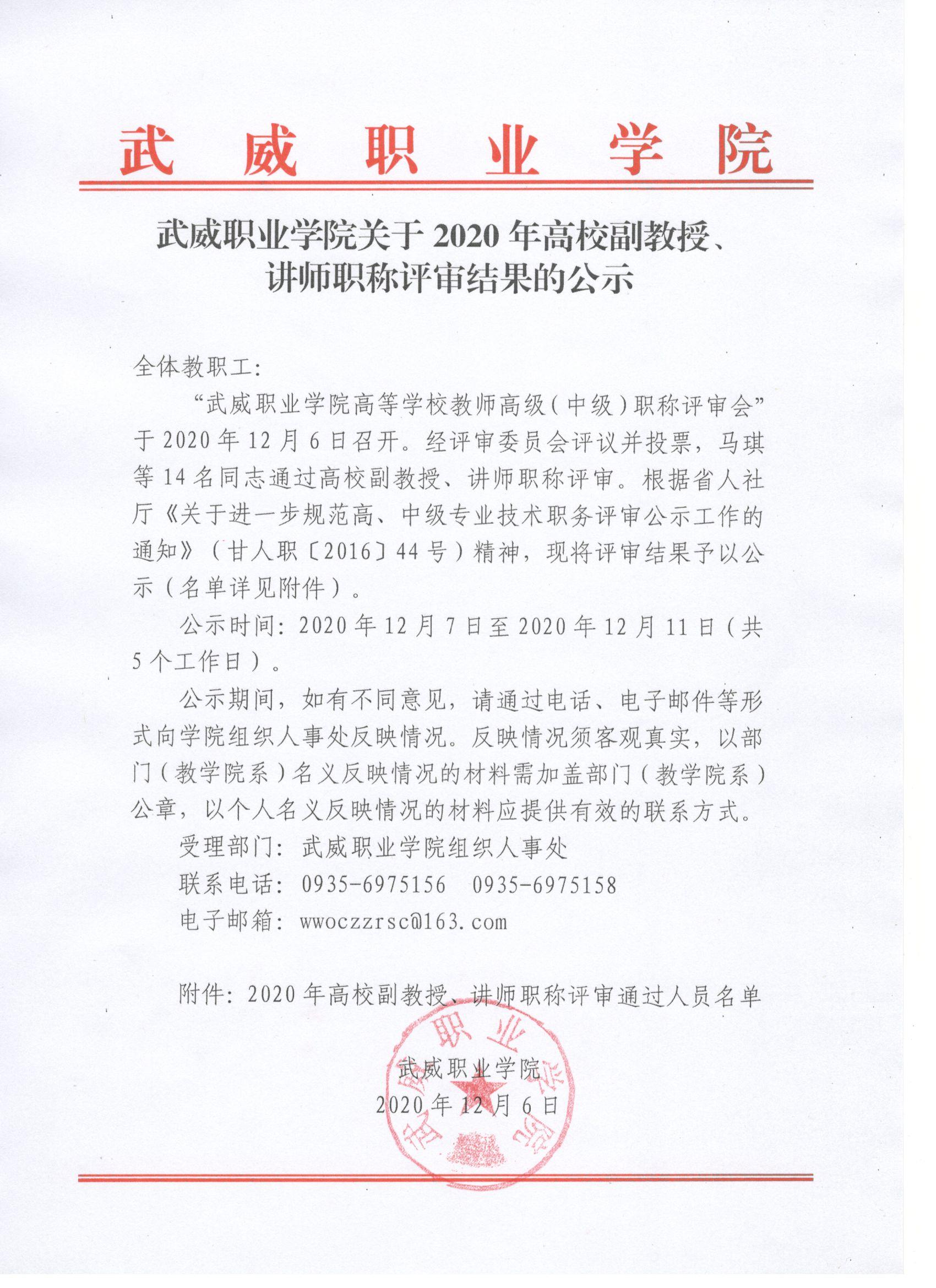 武威職業(yè)學(xué)院關(guān)于2020年高校副教授、講師職稱評審結(jié)果的公示