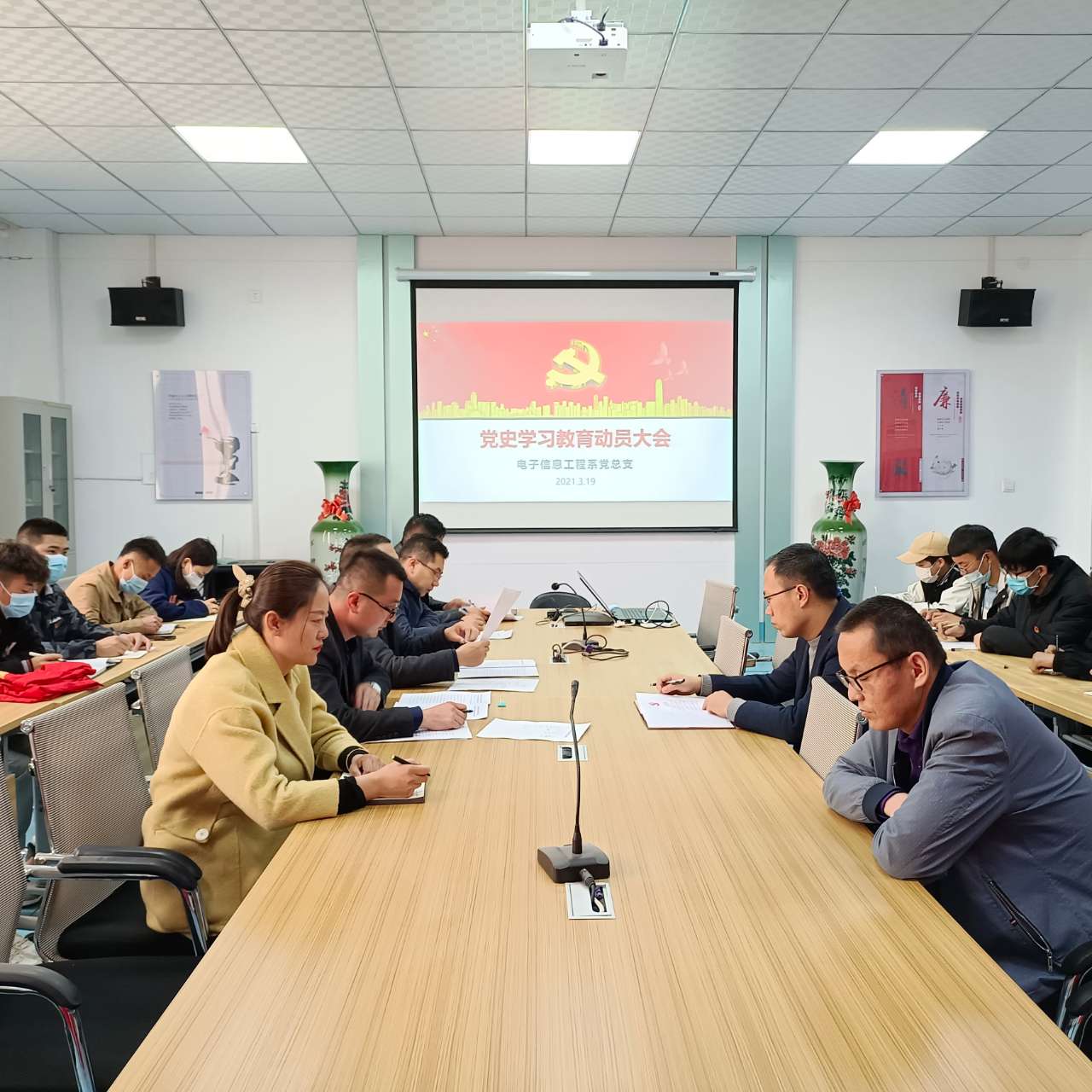 根據(jù)學(xué)院黨委統(tǒng)一安排部署,3月19日,電子信息工程系黨總支召開黨史學(xué)習(xí)教育動員大會,全體教師黨員、學(xué)生入黨積極分子參加會議。會議由黨總支書記袁青年主持。