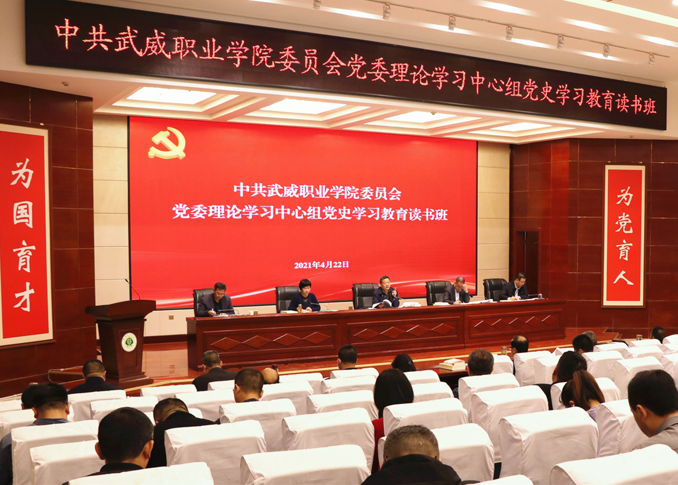 正值第26個“世界讀書日”到來之際,4月22上午,學院黨委理論學習中心組黨史學習教育讀書班暨學習(擴大)會議在大學生活動中心菁英廳舉行。學院領導班子成員、全體中層干部、各基層黨組織書記、專職組織員和支委委員共100人參加讀書班學習。黨委書記、院長趙明主持開班式并講話。