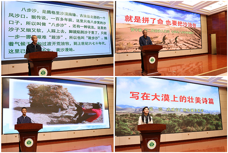 報告會上,二代治沙人代表、八步沙林場場長郭萬剛,二代治沙人代表、八步沙林場職工賀中強,三代治沙人、八步沙林場管護員郭璽、武威市廣播電視臺記者袁潔,分別從綠色承諾、使命責(zé)任、接續(xù)奮斗、記者見證等不同角度、不同側(cè)面,生動再現(xiàn)了“六老漢”三代人治沙造林持續(xù)改善生態(tài)環(huán)境、讓沙漠披綠生金的感人事跡。在場師生無不為“六老漢”三代人的感人事跡深深震撼,紛紛表示要學(xué)習(xí)和繼承“六老漢”三代人困難面前不低頭、敢把沙漠變綠洲的奮斗精神,為建設(shè)美麗中國、實現(xiàn)中華民族永續(xù)發(fā)展貢獻自己的青春力量。