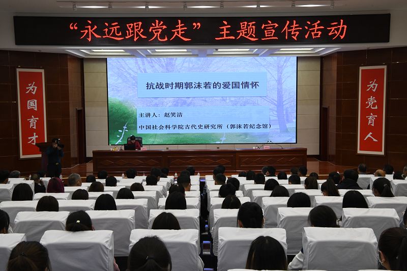 5月21日,中國社會科學(xué)院古代史研究所黨委書記、郭沫若紀(jì)念館原館長趙笑潔來學(xué)院作《抗戰(zhàn)時期郭沫若的愛國情懷》專題講座,學(xué)院在家院領(lǐng)導(dǎo)、副科級以上干部、師生代表共計220人聆聽了講座。