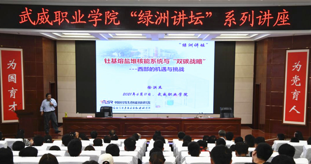 在全院上下深入開(kāi)展黨史學(xué)習(xí)教育之際,為進(jìn)一步推進(jìn)省級(jí)“雙高計(jì)劃”建設(shè),促進(jìn)中科低碳新能源技術(shù)學(xué)院創(chuàng)新發(fā)展,深化學(xué)院教育教學(xué)改革,6月11日,學(xué)院第45期“綠洲講壇”開(kāi)講,本次論壇邀請(qǐng)中國(guó)科學(xué)院上海應(yīng)用物理研究所研究員、博士生導(dǎo)師兼中國(guó)科學(xué)院先進(jìn)核能創(chuàng)新研究院院長(zhǎng)徐洪杰為全院師生作題為《基于釷基熔鹽堆的風(fēng)光核儲(chǔ)多能融合系統(tǒng)——西部“雙碳戰(zhàn)略”之路的機(jī)遇和挑戰(zhàn)》的主旨報(bào)告。中國(guó)科學(xué)院上海應(yīng)用物理研究所黨委書(shū)記、副所長(zhǎng)趙明華研究員,武威園區(qū)園區(qū)辦主任趙先堂,聯(lián)合辦學(xué)主管兼中科低碳新能源技術(shù)學(xué)院院長(zhǎng)助理米麗娟博士出席,學(xué)院領(lǐng)導(dǎo)班子成員、中層干部、各院系師生代表共220余人參加報(bào)告會(huì)。報(bào)告會(huì)由學(xué)院黨委書(shū)記、院長(zhǎng)趙明主持。