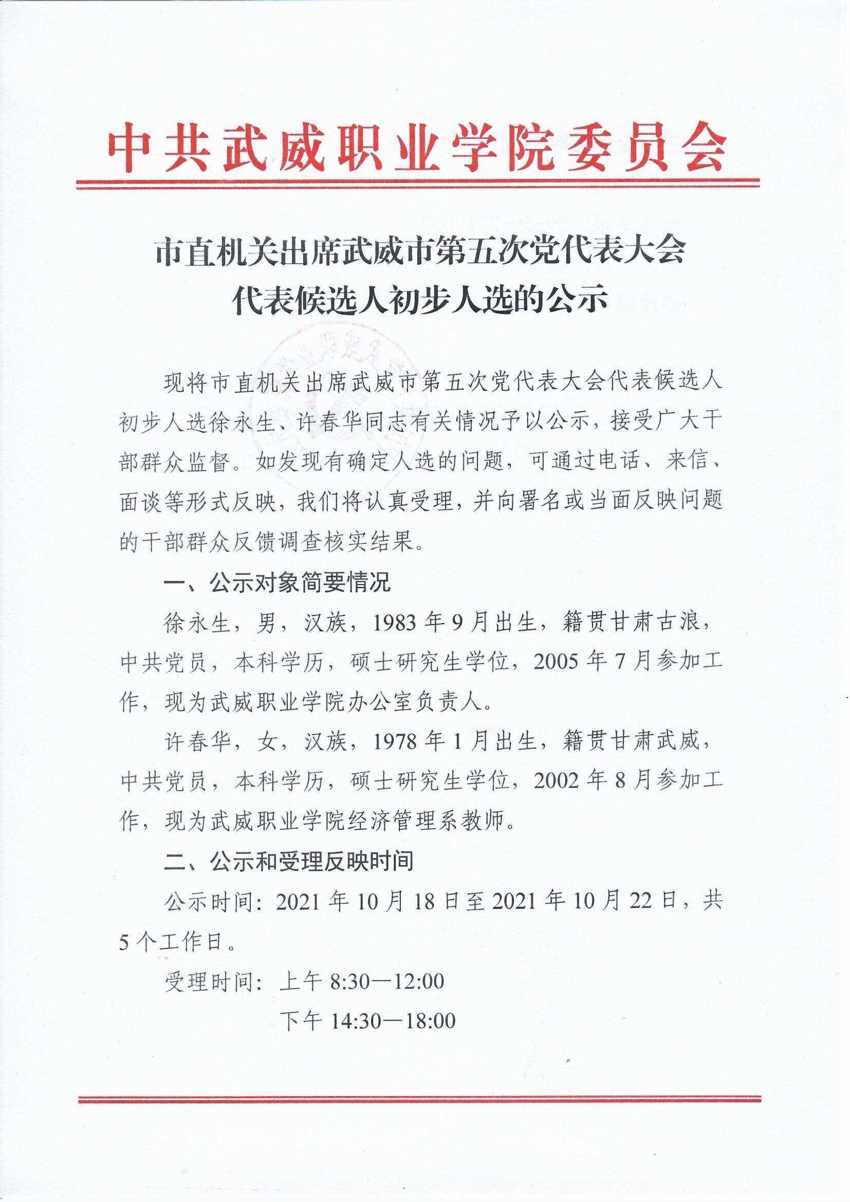 市直機(jī)關(guān)出席武威市第五次黨代表大會(huì)代表候選人初步人選的公示