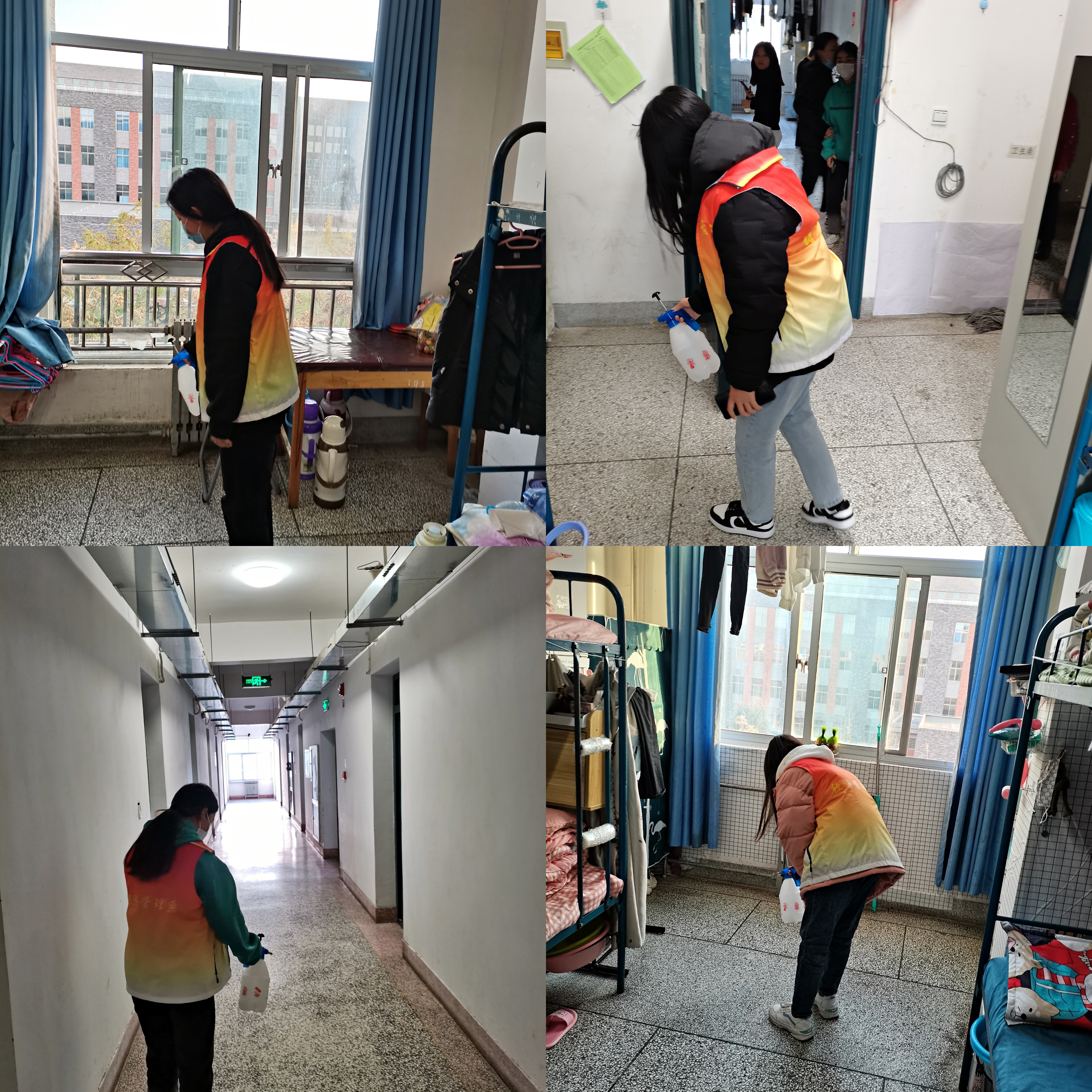 為切實(shí)抓好宿舍及公共區(qū)域防控消殺工作,營(yíng)造安全舒適的學(xué)習(xí)生活環(huán)境,志愿者協(xié)會(huì)根據(jù)不同職能劃分為7個(gè)小組,按照“一天兩次”消殺頻率持續(xù)對(duì)經(jīng)緯樓、3號(hào)學(xué)生公寓等宿舍樓內(nèi)的學(xué)生宿舍進(jìn)行通風(fēng)消毒工作,重點(diǎn)對(duì)宿舍地面、床底、門(mén)角處等位置進(jìn)行全方位、多角度消毒,盡量做到消殺不留死角。同時(shí),志愿者還通過(guò)網(wǎng)絡(luò)平臺(tái)學(xué)習(xí)疫情防控措施相關(guān)知識(shí),并在消殺過(guò)程中為同學(xué)們普及疫情防控知識(shí),全面加強(qiáng)宣傳引導(dǎo),幫助廣大師生在第一時(shí)間了解防疫資訊,有效杜絕謠言傳播,確保廣大師生情緒穩(wěn)定。