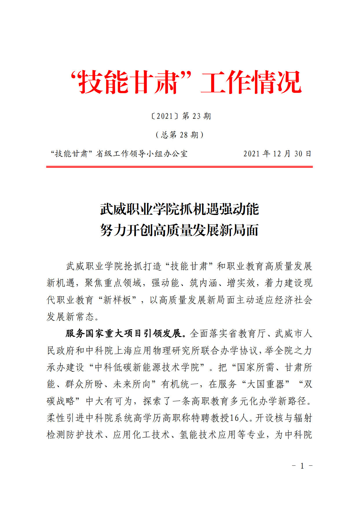 技能甘肅工作情況第28期:武威職業(yè)學院抓機遇強動能努力實現(xiàn)高質(zhì)量發(fā)展