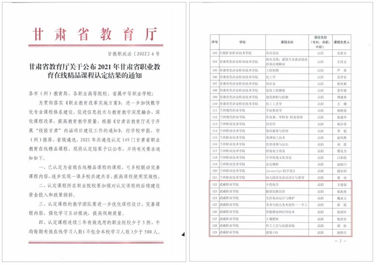 藥學(xué)院王建強(qiáng)負(fù)責(zé)的《中藥化學(xué)》、經(jīng)濟(jì)管理學(xué)院張海燕負(fù)責(zé)的《隴原民族民俗》、中科低碳新能源技術(shù)學(xué)院魏顯文負(fù)責(zé)的《光伏電站運(yùn)行與維護(hù)》、張國(guó)祥負(fù)責(zé)的《智能微電網(wǎng)應(yīng)用技術(shù)》、藝術(shù)與教育學(xué)院薛媛負(fù)責(zé)的《美術(shù)與幼兒美術(shù)創(chuàng)作——手工》、現(xiàn)代農(nóng)業(yè)學(xué)院柴貴賢負(fù)責(zé)的《土壤肥料》、工程技術(shù)學(xué)院頡棟負(fù)責(zé)的《焊接工藝與技能訓(xùn)練》、趙特慶負(fù)責(zé)的《建筑CAD》8門課程獲評(píng)甘肅職業(yè)教育在線精品課程。