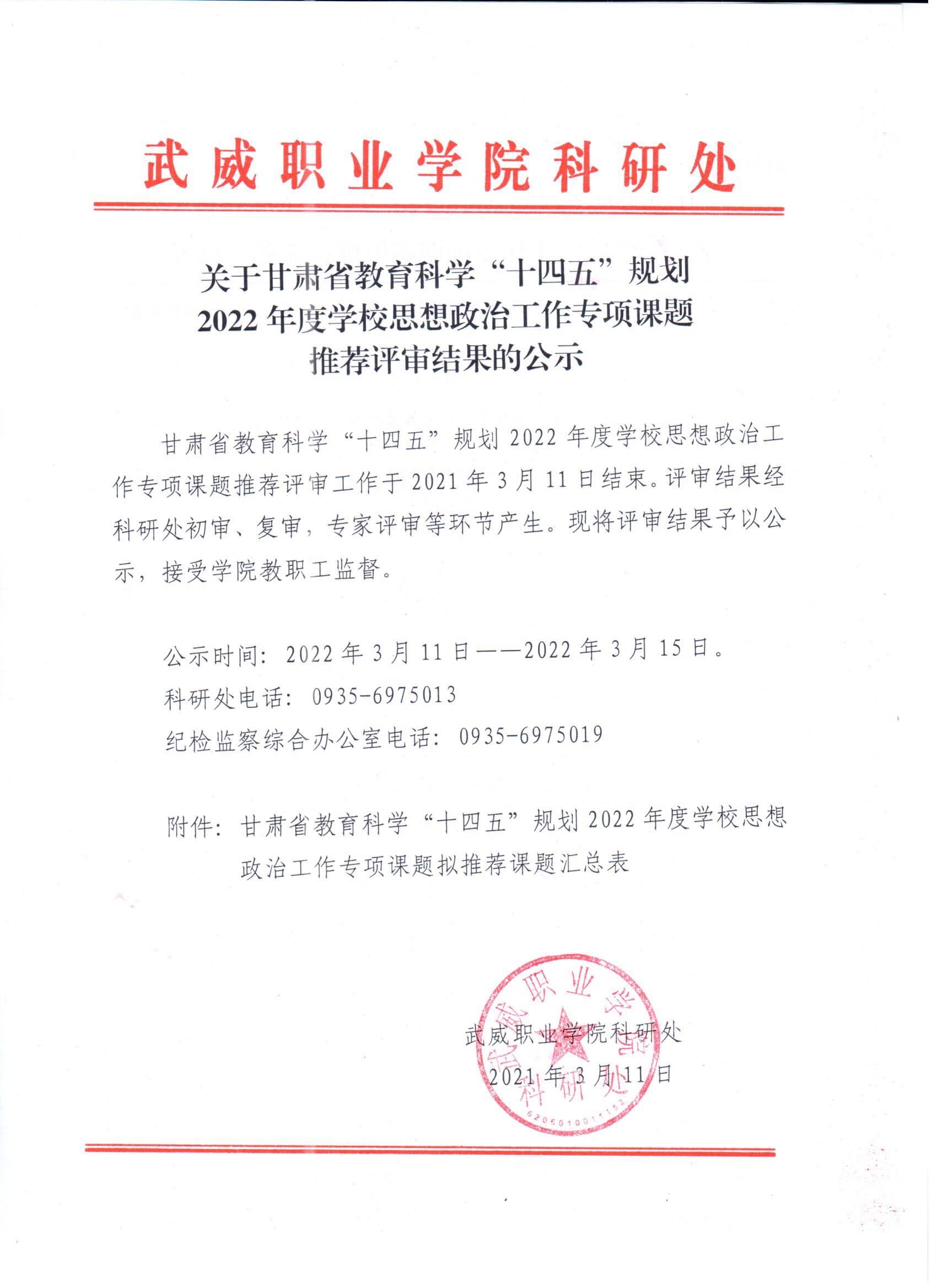 關(guān)于甘肅省教育科學(xué)“十四五”規(guī)劃2022年度學(xué)校思想政治工作專項(xiàng)課題推薦評審結(jié)果的公示