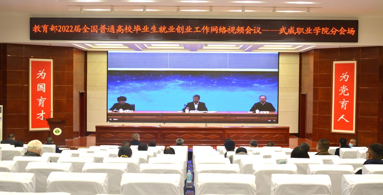 11月19日下午,教育部、人力資源社會保障部召開2022屆普通高校畢業(yè)生就業(yè)視頻會議。教育部黨組書記、部長懷進鵬,人力資源社會保障部黨組成員、副部長李忠出席會議并講話,教育部黨組成員、副部長翁鐵慧主持會議。我院設(shè)立武威職業(yè)學院分會場,學院黨委書記、院長趙明,副院長王守云,招就處、雙創(chuàng)中心、學工處相關(guān)負責同志,各教學院系黨總支書記、主任、就業(yè)工作輔導員及畢業(yè)班班主任共計86人,在學院學生發(fā)展中心菁英廳集中參加網(wǎng)絡視頻會議。