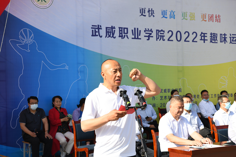 裁判員代表葉祥偉和運動員代表楊春芳分別代表裁判員和運動員進行宣誓。隨后,趙明宣布“武威職業(yè)學院2022年趣味運動會開幕”!全場響起熱烈的掌聲。