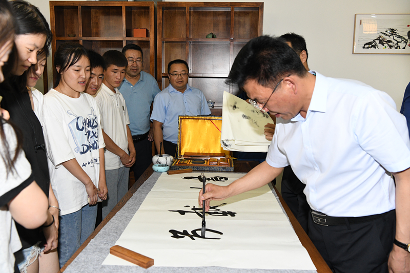 趙明在致辭中向市文旅局、市書畫院及齊澤山先生長期以來對學(xué)校改革發(fā)展給予的關(guān)心和支持表示衷心的感謝。他表示,齊澤山先生為學(xué)校捐贈的書法作品為整個校園人文景觀和文化環(huán)境增添了濃墨重彩的一筆,促進了樓宇文化建設(shè)。學(xué)校將珍惜并運用好這些優(yōu)質(zhì)文化資源,發(fā)揮好藝術(shù)作品的審美功能、教育功能,用藝術(shù)熏陶和精神洗禮進一步激勵廣大師生。