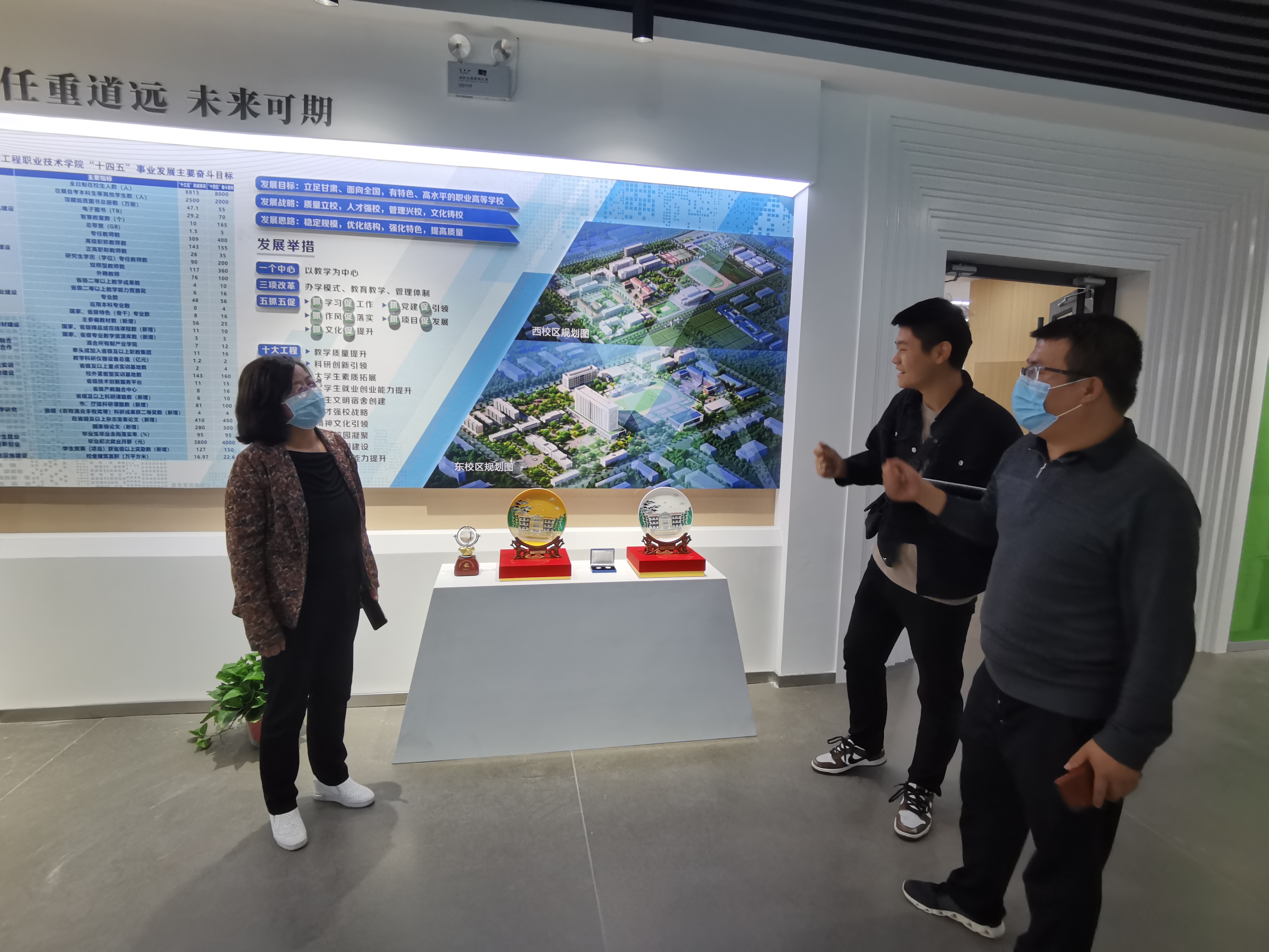 為全面推進“雙高計劃”學(xué)校建設(shè),提升圖書館服務(wù)水平,營造“書香校園”,將圖書館打造成人性化、智能化、專業(yè)化的綠色學(xué)習(xí)空間。近日,圖書館館長楊如松、副館長蔡濟眾、館員楊建盛三人到甘肅省畜牧工程職業(yè)技術(shù)學(xué)院圖書館考察學(xué)習(xí),在甘肅省畜牧工程職業(yè)技術(shù)學(xué)院圖書館館長解玉寶陪同下,參觀了該校圖書館讀書吧、校史館、黨史館、“挑戰(zhàn)杯”獲獎作品展覽館等處,解玉寶講解了該館設(shè)計理念及建設(shè)過程中的側(cè)重點和展示重點。楊如松就現(xiàn)在圖書館裝發(fā)展趨勢、圖書館管理辦法、學(xué)生借閱量等實際問題同解玉寶進行了相互交流。