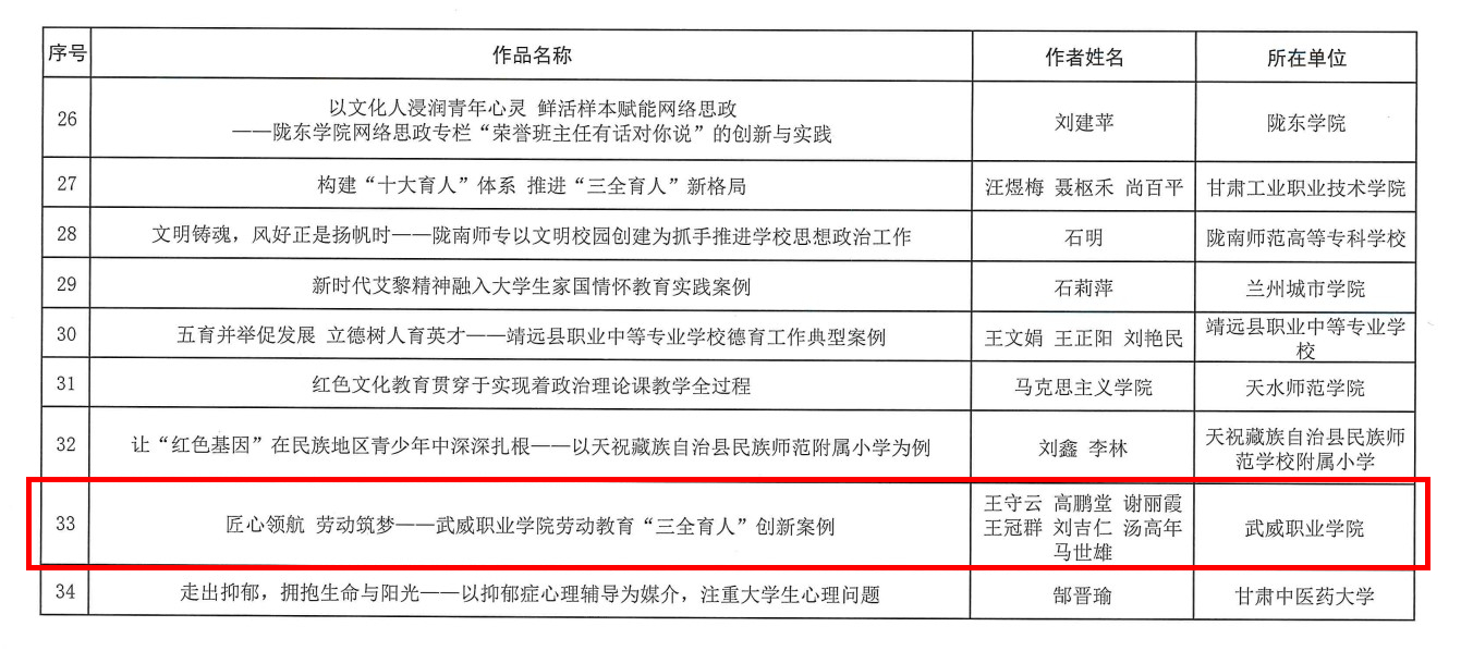 近日,2022年全省學(xué)校思想政治教育工作成果征集活動評選結(jié)果公布,武威職業(yè)學(xué)院喜獲佳績,兩件作品獲獎。其中,王守云、高鵬堂、謝麗霞、王冠群、劉吉仁、湯高年、馬世雄老師的《匠心領(lǐng)航 勞動筑夢—武威職業(yè)學(xué)院勞動教育“三全育人”創(chuàng)新案例》獲思想政治典型案例三等獎;張保海、馮文娟、謝麗霞老師的《基于“診改”的思政教育質(zhì)量評價體系構(gòu)建研究》獲思想政治論文三等獎。
