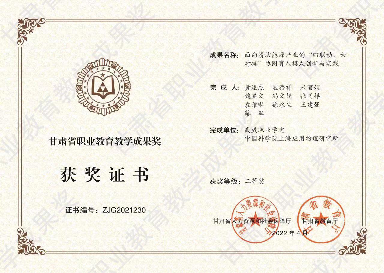 近日,甘肅省人力資源和社會保障廳、甘肅省教育廳下發(fā)《關(guān)于表彰2021年甘肅省職業(yè)教育教學(xué)成果獎的決定》。我校中科低碳新能源技術(shù)學(xué)院與中國科學(xué)院上海應(yīng)用物理研究所聯(lián)合完成的《面向清潔能源產(chǎn)業(yè)的“四聯(lián)動、六對接”協(xié)同育人模式創(chuàng)新與實踐》成果獲得二等獎。