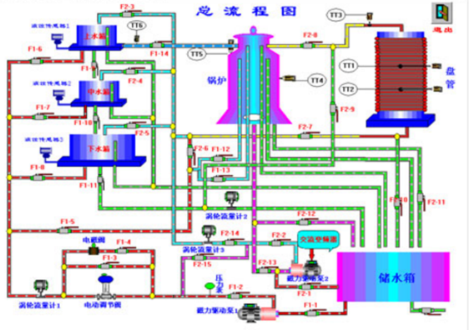 高級過程控制系統(tǒng)主要特點是被調(diào)參數(shù)囊括了流量、壓力、液位、溫度四大熱工參數(shù);執(zhí)行器中既有電動調(diào)節(jié)閥儀表類執(zhí)行機構(gòu),又有變頻器等電力拖動類執(zhí)行器。系統(tǒng)除了能改變調(diào)節(jié)器的設定值作階躍擾動外,還可在對象中通過電磁閥和手操作閥制造各種擾動。一個被調(diào)參數(shù)可用不同的動力源、不同的執(zhí)行器和不同的工藝線路下可演變成多種調(diào)節(jié)回路,以利于討論、比較各種調(diào)節(jié)方案的優(yōu)劣,從而進行多變量控制系統(tǒng)及特定的高級過程控制系統(tǒng)實驗。
