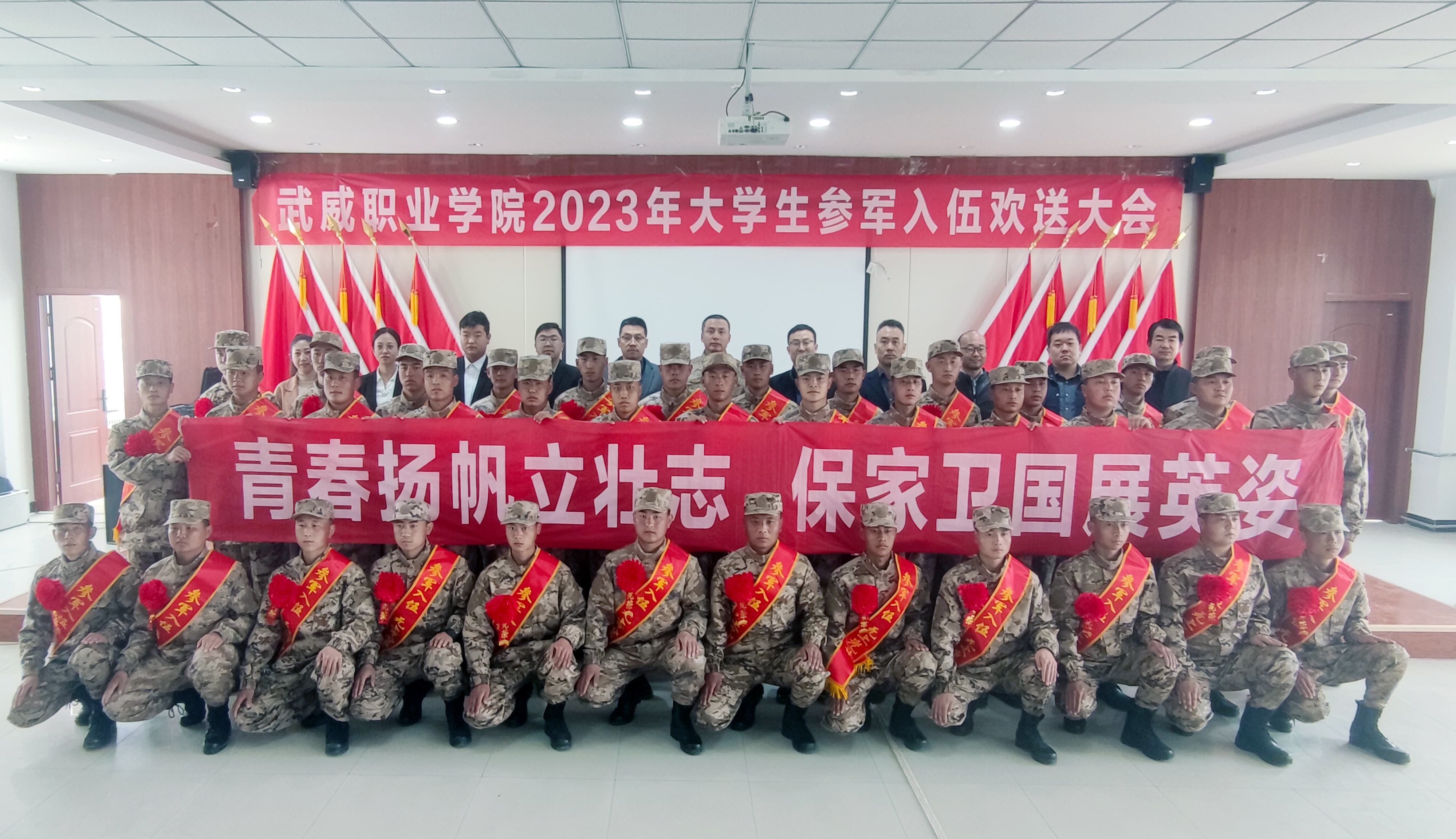 錚錚鐵骨正青春,參軍報(bào)國正當(dāng)時(shí)。3月15日,從學(xué)校報(bào)名入伍的31名大學(xué)生在武南役前教育訓(xùn)練基地整裝待發(fā),即將離開母校奔赴軍營,投身祖國最需要的地方。學(xué)校學(xué)生工作處(武裝部)、招生就業(yè)處負(fù)責(zé)人和各二級學(xué)院輔導(dǎo)員、班主任代表前往訓(xùn)練基地慰問歡送。涼州區(qū)人民武裝部上校部長金鑫受邀出席歡送大會并講話。