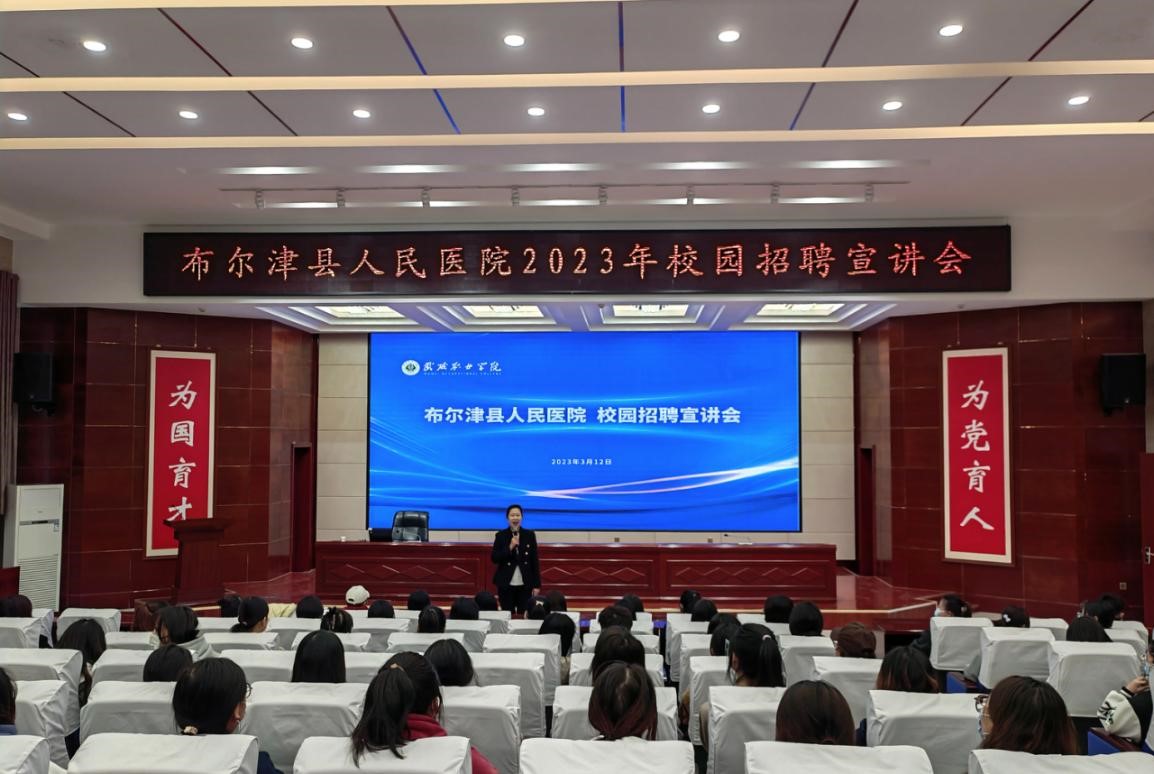 李娟介紹了布爾津縣人民醫(yī)院的基本情況、發(fā)展思路和人才需求,表達(dá)了對此次合作的美好祝愿。王守云對李娟一行來?,F(xiàn)場簽約表示了歡迎,也對布爾津縣人民醫(yī)院近年的發(fā)展成果給予了高度評價。雙方表示,希望今后在學(xué)生實習(xí)實訓(xùn)、人才培養(yǎng)質(zhì)量、畢業(yè)生實習(xí)就業(yè)、教師職業(yè)能力提升等方面加強合作,拓寬合作范圍。簽約儀式結(jié)束后,布爾津縣人民醫(yī)院在學(xué)生發(fā)展中心舉行了校園招聘宣講活動,約200名師生參加,部分學(xué)生現(xiàn)場達(dá)成實習(xí)就業(yè)意向。