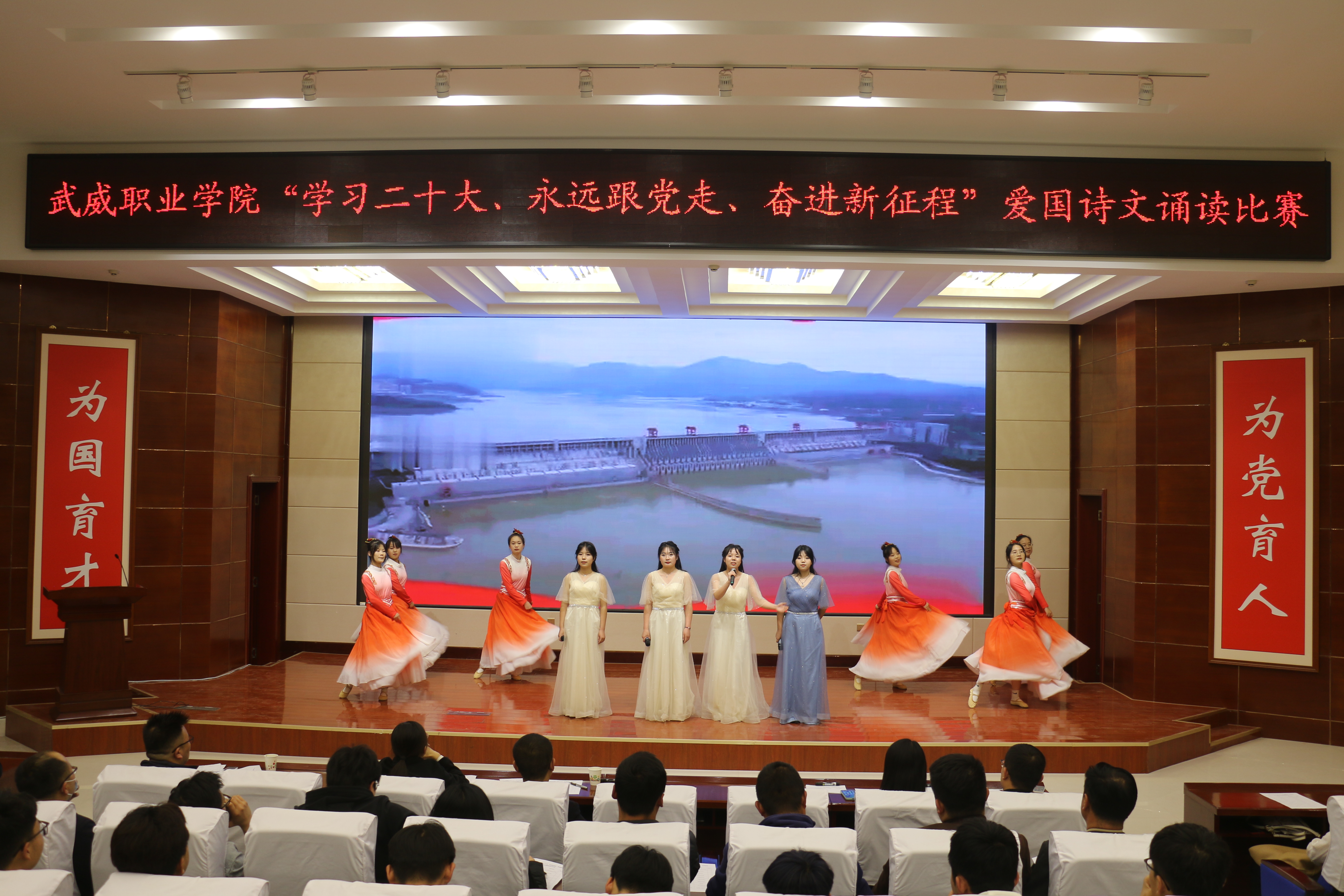 大賽于3月啟動(dòng),歷時(shí)一個(gè)月,各二級(jí)學(xué)院經(jīng)過初賽評(píng)比推選出9個(gè)優(yōu)秀節(jié)目入圍決賽。比賽現(xiàn)場(chǎng),各參賽隊(duì)以“學(xué)習(xí)二十大、永遠(yuǎn)跟黨走、奮進(jìn)新征程”為主題,將傳承經(jīng)典詩文和弘揚(yáng)愛國(guó)主義精神結(jié)合,誦詩抒情、借詞言志,熱情謳歌中國(guó)共產(chǎn)黨不懈奮斗的光輝歷程,全面展現(xiàn)新時(shí)代青年以夢(mèng)為馬,不負(fù)韶華的青春風(fēng)貌。校團(tuán)委原創(chuàng)編排表演的節(jié)目《追夢(mèng)八步沙,奮斗正青春》,深情動(dòng)人,感染全場(chǎng),歌頌了“六老漢”矢志艱苦奮斗的隴人品格,抒發(fā)了當(dāng)代青年永跟黨走,青春建功的豪情壯志。富余藝術(shù)感染力的經(jīng)典吟誦,穿插舞蹈、劇情和紅歌演唱,為廣大師生呈現(xiàn)了一場(chǎng)視聽盛宴。