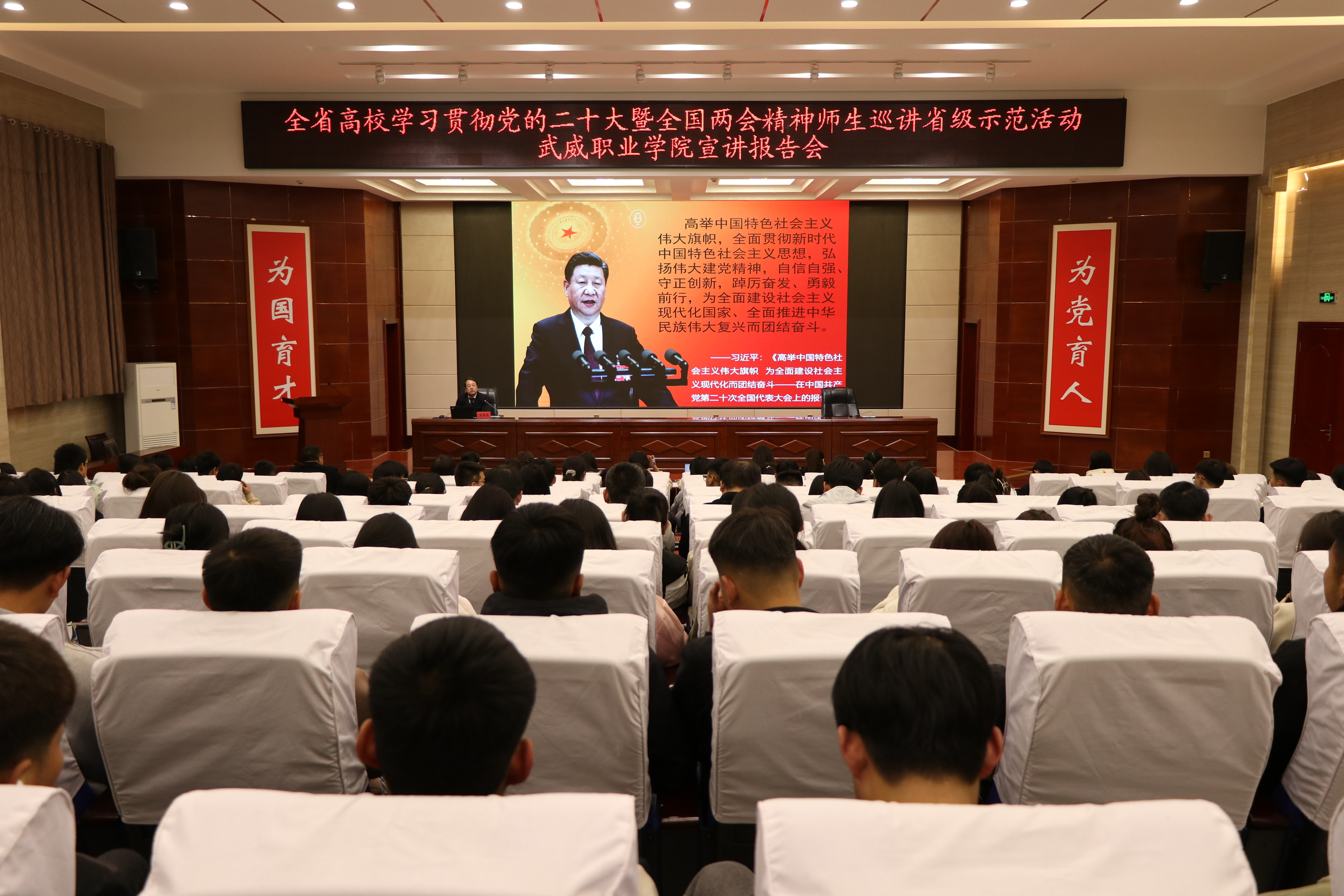 4月23日下午,省委教育工委“逐夢(mèng)新征程 奮斗創(chuàng)未來(lái)”全省高校學(xué)習(xí)貫徹黨的二十大暨全國(guó)兩會(huì)精神師生巡講省級(jí)示范活動(dòng),第五巡講團(tuán)來(lái)我校開展宣講。第五巡講團(tuán)組長(zhǎng)、蘭州交通大學(xué)馬克思主義學(xué)院蘇星鴻教授,作了專題報(bào)告。學(xué)校宣傳統(tǒng)戰(zhàn)部全體成員、馬克思主義學(xué)院全體教師、各二級(jí)學(xué)院學(xué)生代表共計(jì)200余人聆聽了巡講報(bào)告。