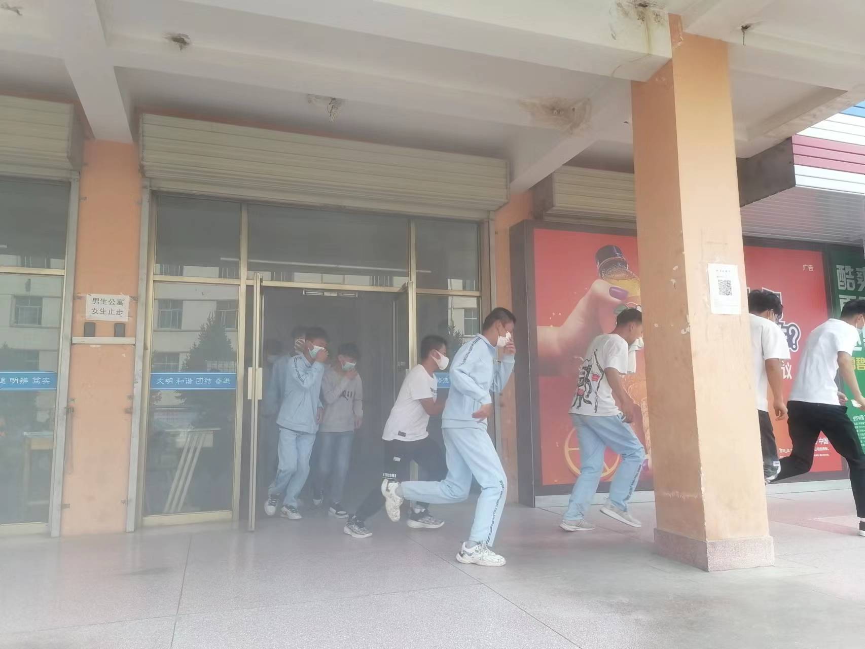 15時(shí)20分,疏散演練正式開始。隨著火災(zāi)警報(bào)響起,安全保衛(wèi)工作人員點(diǎn)燃煙餅,在學(xué)生公寓樓模擬火災(zāi)現(xiàn)場(chǎng),冒出滾滾濃煙,公寓管理人員迅速組織學(xué)生有序疏散。在輔導(dǎo)員、班主任的引導(dǎo)下,同學(xué)們按照動(dòng)作要領(lǐng),用濕毛巾捂住口鼻,俯身彎腰按照安全出口指示牌快速、有序從疏散通道撤離到體育場(chǎng),整個(gè)過程緊張有序,實(shí)用性強(qiáng),達(dá)到了預(yù)期效果。
