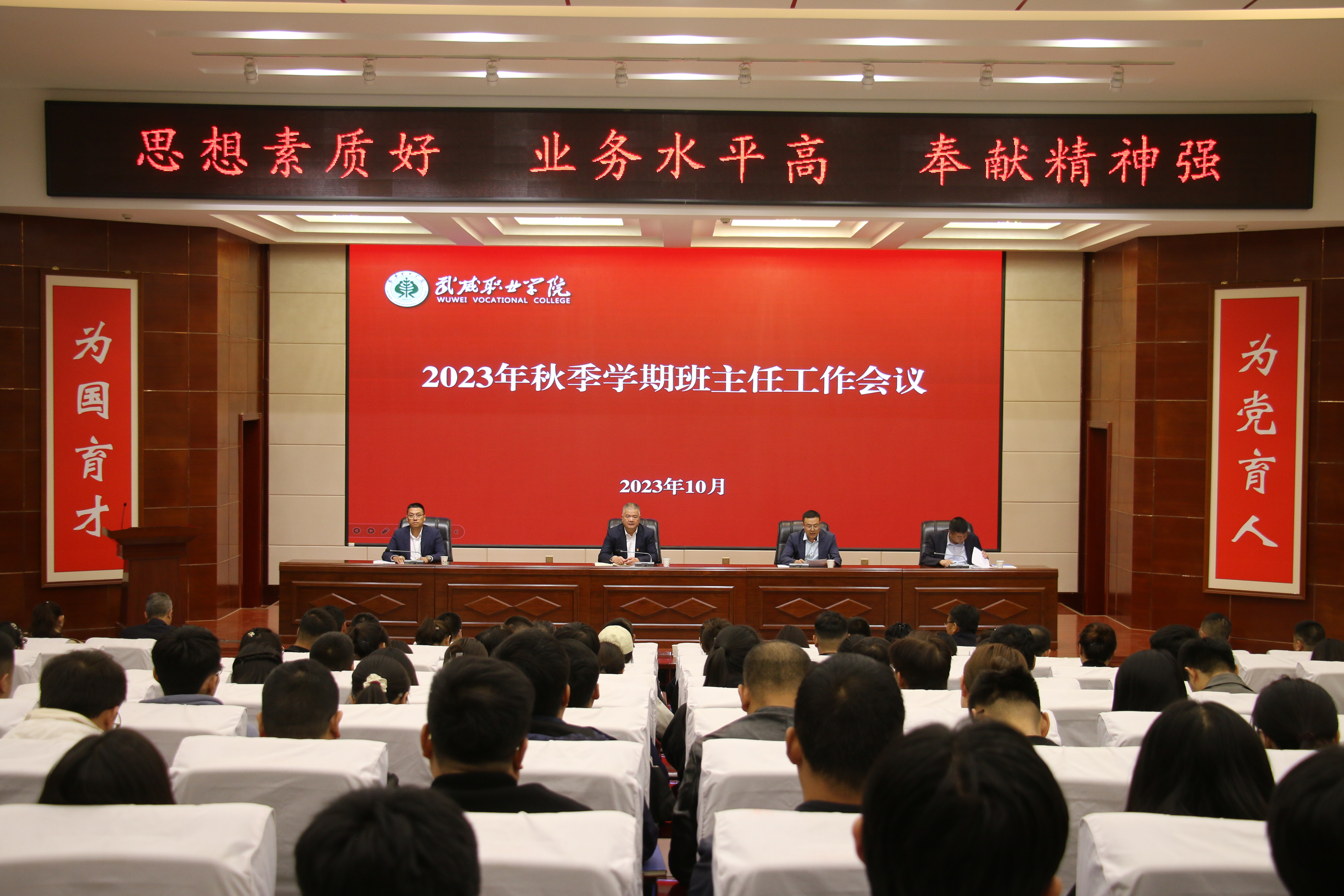 會(huì)議上,高鵬堂領(lǐng)學(xué)了《武威職業(yè)學(xué)院班主任工作實(shí)施辦法》《武威職業(yè)學(xué)院班主任工作考核辦法》等制度文件,結(jié)合具體工作提出要求;招生就業(yè)處負(fù)責(zé)人董鵬、安全保衛(wèi)處負(fù)責(zé)人李欣就班主任相關(guān)工作進(jìn)行了說明和要求;中科低碳新能源技術(shù)學(xué)院負(fù)責(zé)人胡建宏針對班導(dǎo)師工作進(jìn)行了交流發(fā)言,護(hù)理學(xué)院黨總支書記張建輝針對班主任管理工作進(jìn)行了交流發(fā)言,武威市優(yōu)秀班主任獲得者、經(jīng)濟(jì)管理學(xué)院教師姚盈就班主任工作經(jīng)驗(yàn)和心得進(jìn)行了交流發(fā)言。