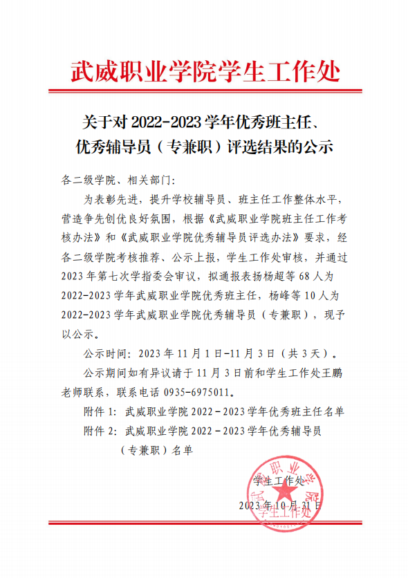 關(guān)于對2022-2023學(xué)年優(yōu)秀班主任、優(yōu)秀輔導(dǎo)員(專兼職)評選結(jié)果的公示