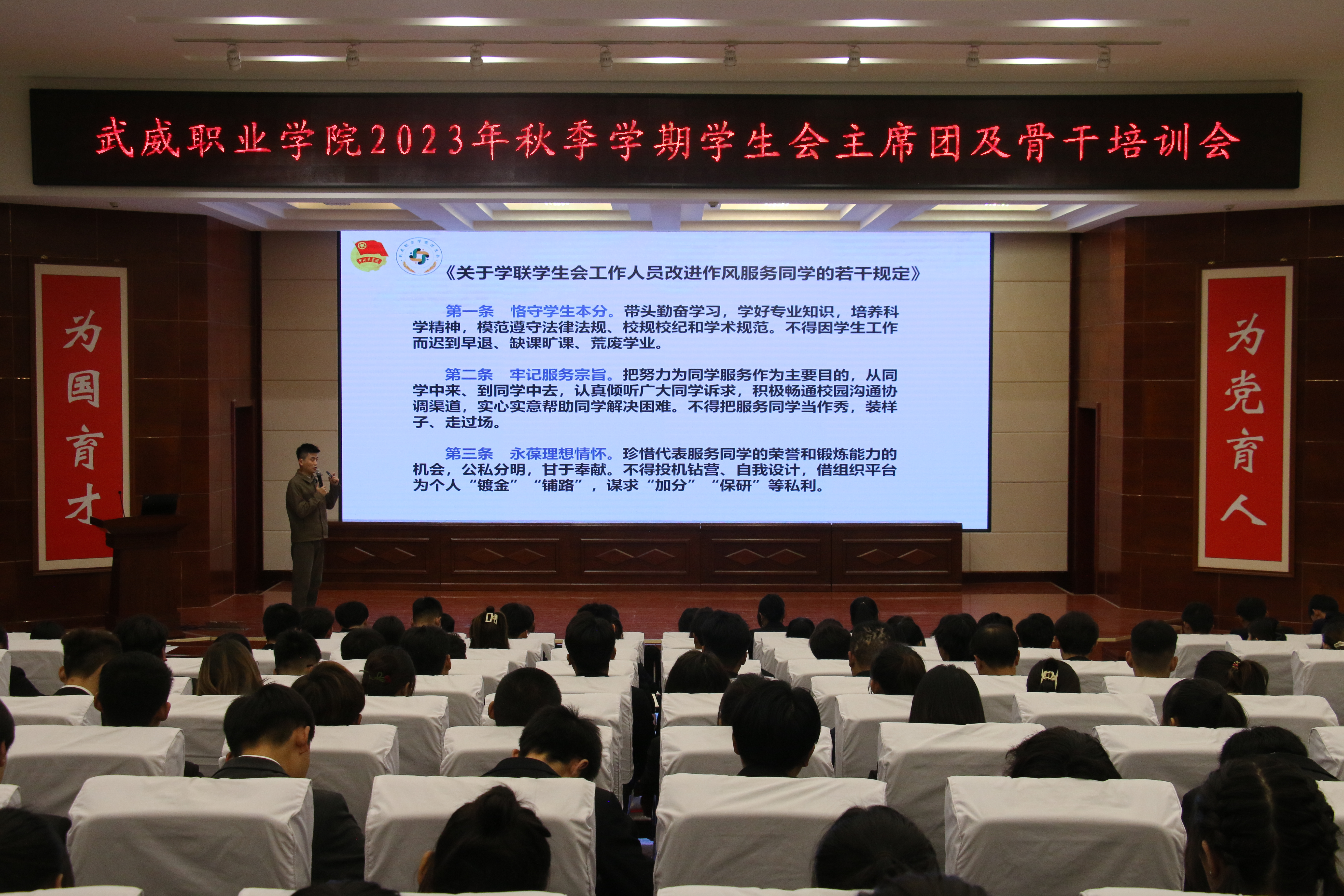 校學生會主席團成員帶頭領學了《關于學聯(lián)學生會工作人員改進作風服務同學的若干規(guī)定》《武威職業(yè)學院學生會章程》等制度文件。學生會秘書長張登海以《微光凝聚星海,筑夢情懷方舟》為題,圍繞加強思想政治建設、深化學生會組織改革和進一步加強從嚴治會等方面,為學生會組織成員展開培訓。