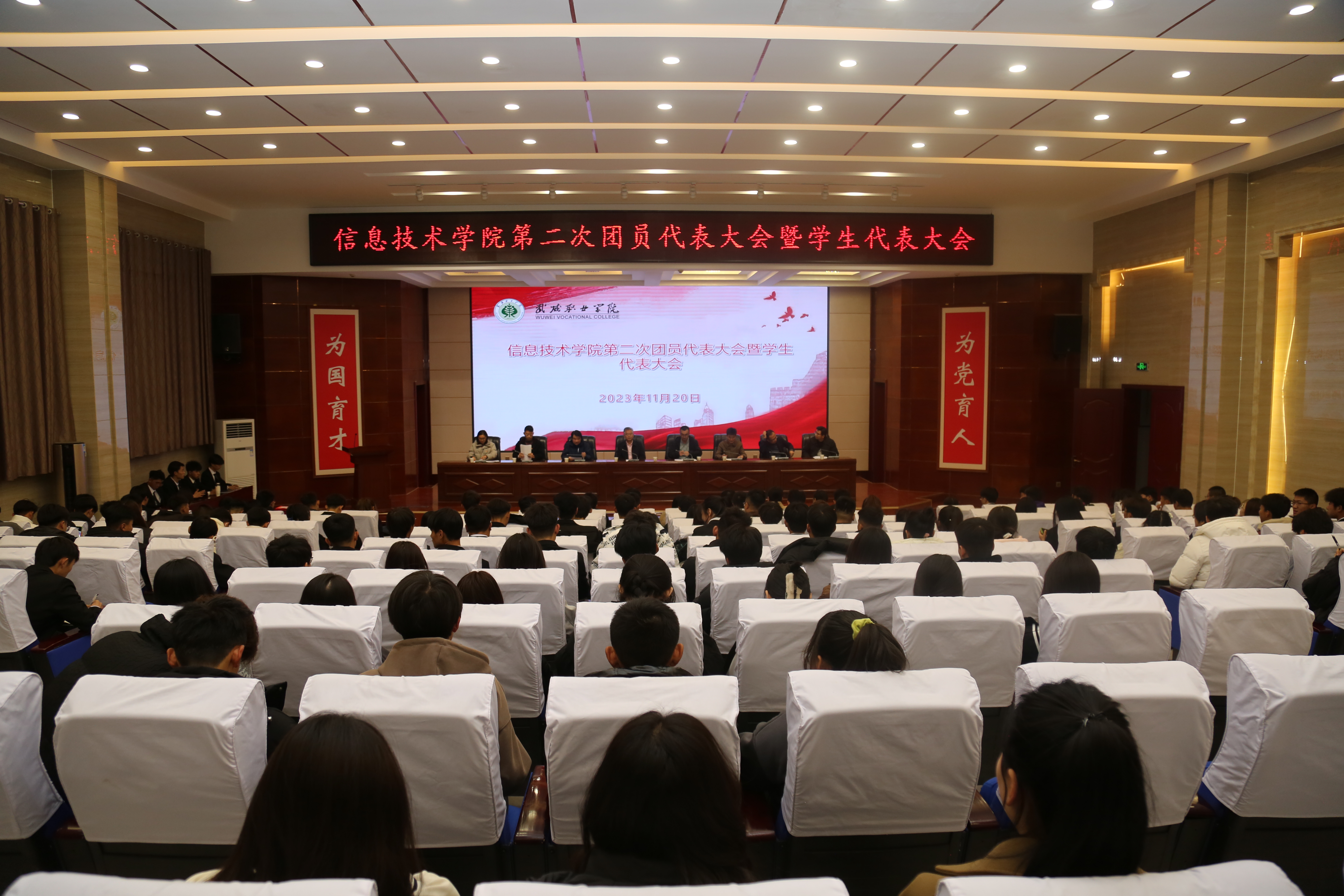 2023年11月20日,信息技術學院第二次團員代表大會暨學生代表大會在菁英廳隆重召開。信息技術學院黨總支書記潘從明、校團委張登海及師生代表共200余人參加會議。