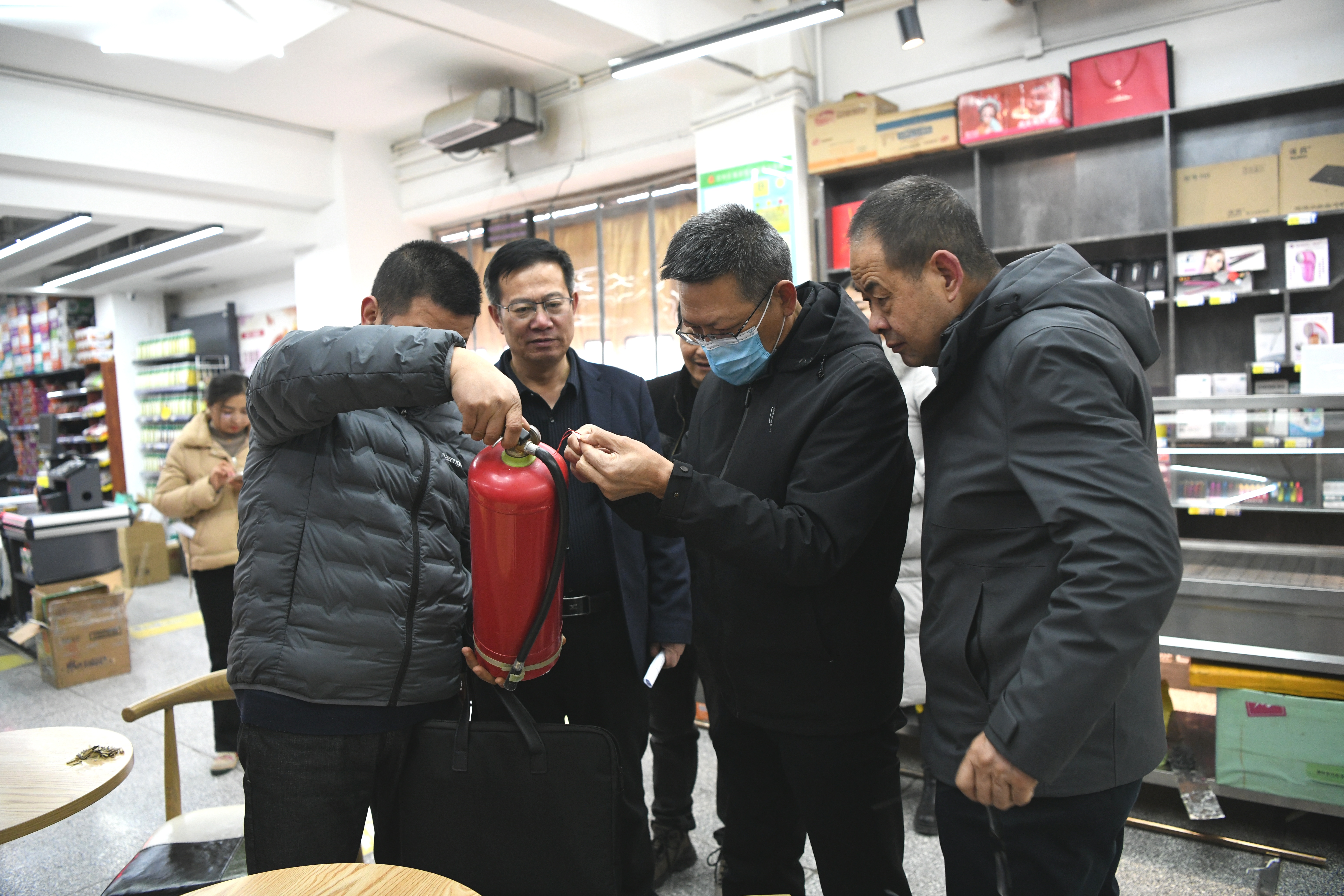 在實(shí)驗(yàn)實(shí)訓(xùn)室內(nèi),督察組詢問(wèn)設(shè)施設(shè)備準(zhǔn)備情況,逐一檢查實(shí)訓(xùn)場(chǎng)地內(nèi)消防安全設(shè)施配備情況。